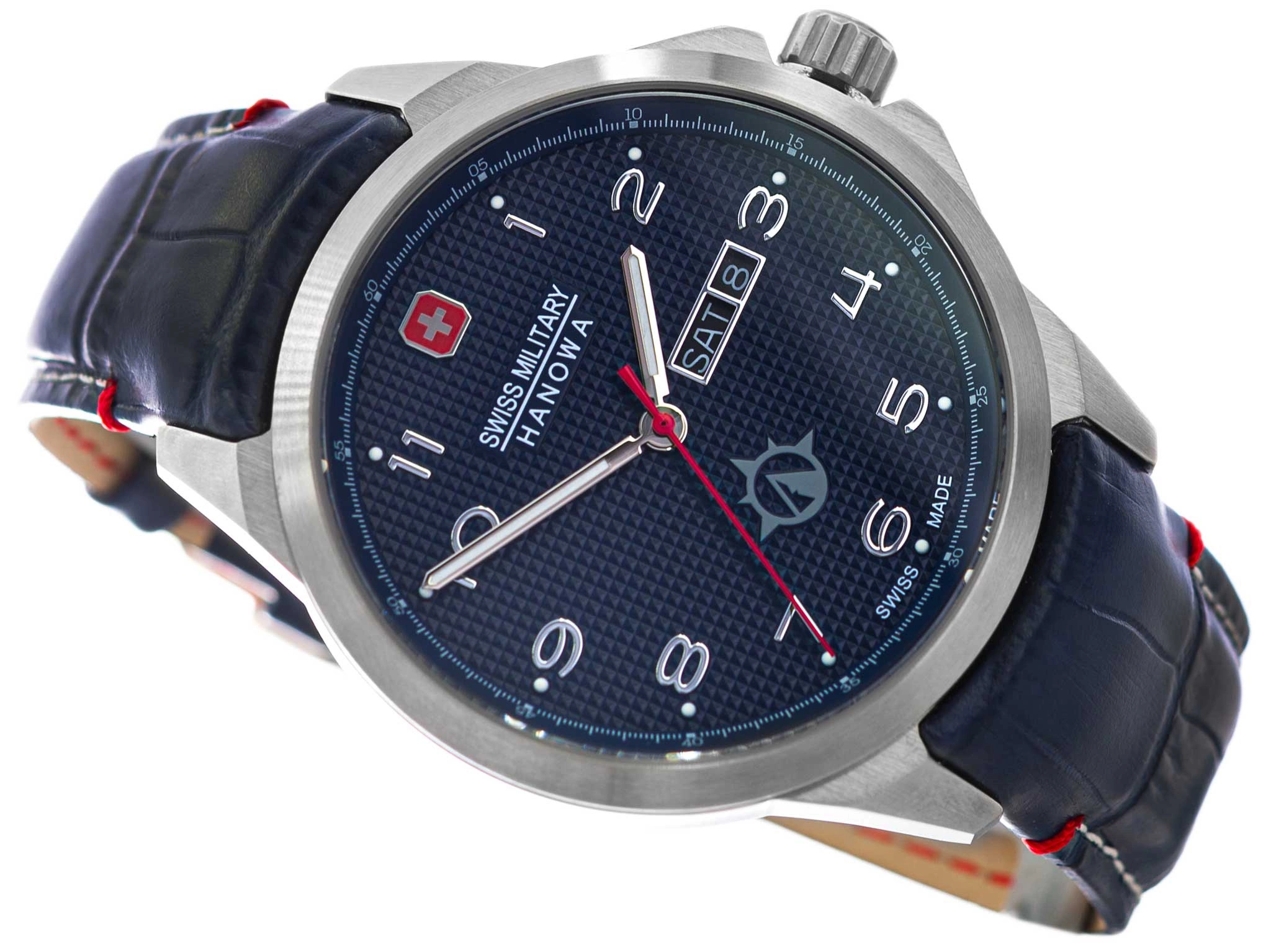 • Wodoszczelny Zegarek Męski Swiss Military Hanowa SMWGB2100301 granatowy na pasku. Posiada funkcje datownika i neobrite.
