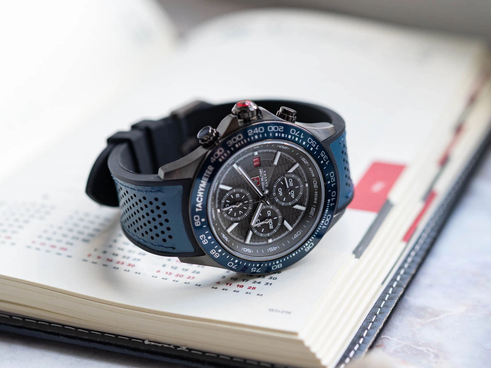 Za precyzyjne odmierzanie czasu odpowiada szwajcarski mechanizm kwarcowy zasilany baterią, znany ze swojej niezawodności i dokładności. Grafitowa tarcza o delikatnej, półmatowej strukturze mieści trzy subtarcze — odpowiadające ze pracę sekundnika oraz stopera analogowego. Wyróżniające się białe i srebrne indeksy zostały starannie rozmieszczone dla zachowania pełnej przejrzystości kompozycji, a wyraźne wskazówki z powłoką neobrite zapewniają po wcześniejszym naświetleniu doskonałą czytelność w warunkach słabego oświetlenia. Elementem, który przyciąga uwagę, jest wyraźnie oznaczona podziałka tachymetru umieszczona na pierścieniu, pozwalająca na szybkie obliczenia prędkości na podstawie czasu i dystansu — funkcja szczególnie przydatna dla miłośników motoryzacji i aktywności outdoorowych. Na godzinie trzeciej umieszczono niewielki datownik w kolorze czerwonym, który wskazuje aktualny dzień miesiąca, dyskretnie przełamując stonowaną kolorystykę tarczy. Nad wszystkim czuwa odporne na zarysowania szkło szafirowe, gwarantujące niezmienny, elegancki wygląd przez długi czas. Zegarek jest wodoszczelny do 10 ATM, co oznacza, że można z niego bezpiecznie korzystać podczas kąpieli, pływania czy uprawiania sportów wodnych, bez ryzyka uszkodzenia mechanizmu. Model Swiss Military Hanowa SMWGO0003440 Watchman dostarczany jest w firmowym pudełku Swiss Military Hanowa, które podkreśla prestiż marki i sprawia, że zegarek idealnie sprawdzi się także jako elegancki i praktyczny prezent dla miłośnika sportowej elegancji.