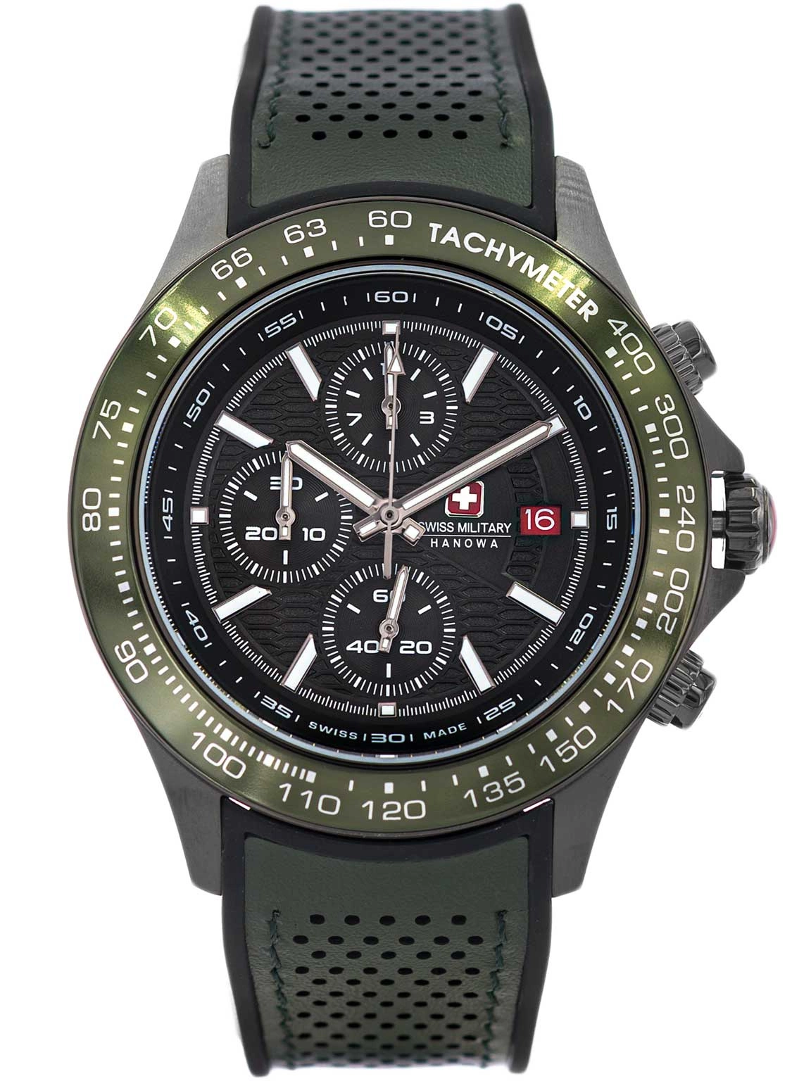 • Wodoszczelny Zegarek Męski Swiss Military Hanowa SMWGO0003441 zielony na pasku. Posiada funkcje chronografu, datownika i neobrite.