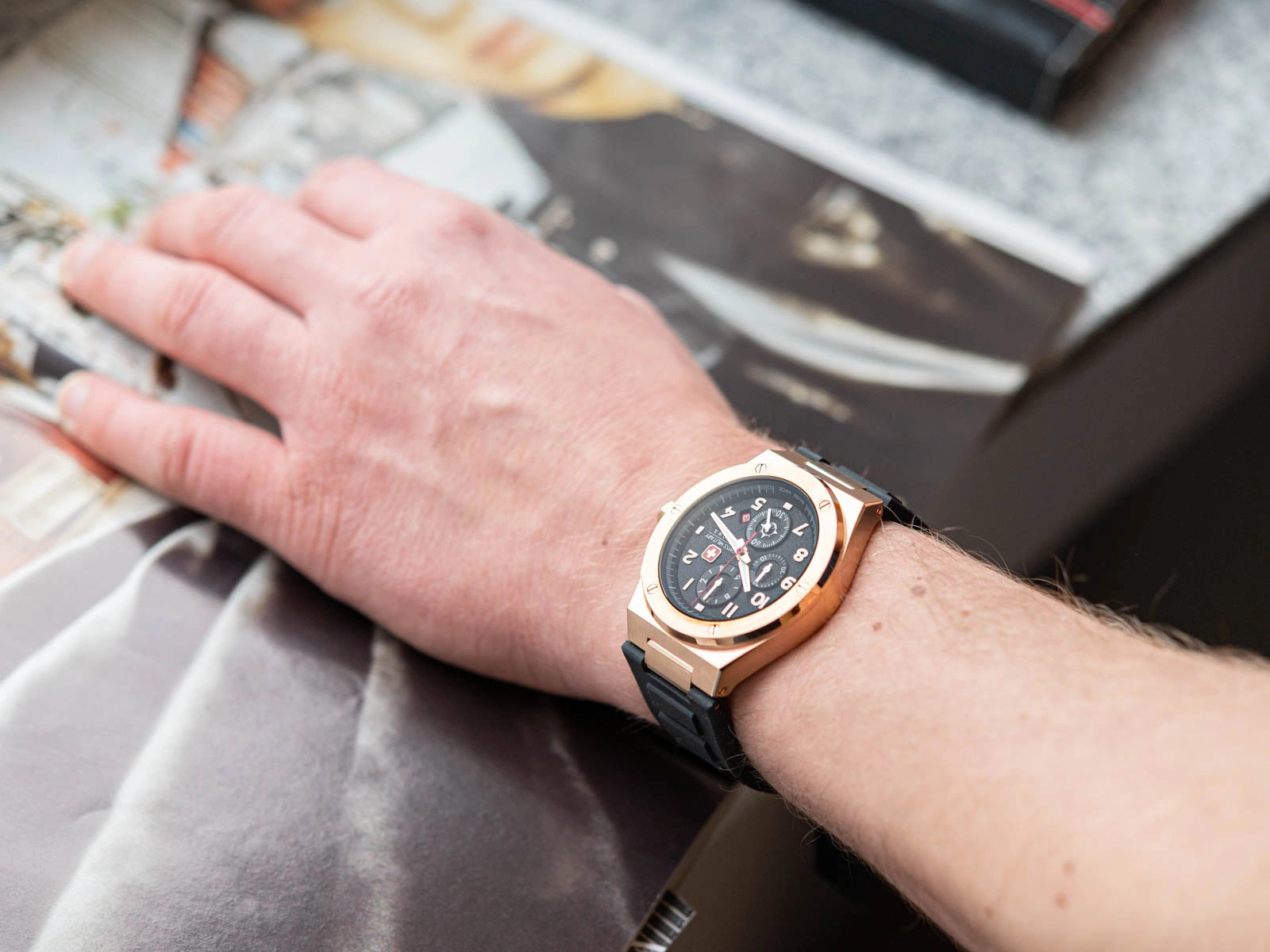 Swiss Military Hanowa SMWGO2102010 Sonoran Chrono to męski zegarek, który łączy sportową funkcjonalność z nowoczesnym, przyciągającym uwagę designem. Model ten wyróżnia się kontrastowym zestawieniem barw oraz starannie dopracowanymi detalami, tworząc spójny i dynamiczny projekt, który doskonale sprawdzi się zarówno na co dzień, jak i podczas aktywności sportowych. Koperta zegarka wykonana została z wysokiej jakości stali szlachetnej i wykończona powłoką w kolorze różowego złota, nadając całości eleganckiego i nieco ekstrawaganckiego charakteru. Jej powierzchnia doskonale komponuje się z czarną tarczą, na której rozmieszczono trzy subtarcze chronografu oraz datownik umieszczony między godziną czwartą a piątą. Wskazówki godzinowe i minutowe, w kolorze bieli i różowego złota, zapewniają dobrą widoczność i dodają zegarkowi nowoczesnej głębi. Zastosowane fosforyzujące powłoki neobrite na wskazówkach i indeksach umożliwiają po wcześniejszym naświetleniu wygodne odczytanie godziny również po zmroku. Tarcza chroniona jest przez odporne na zarysowania szkło szafirowe, które utrzymuje przejrzystość i odporność na codzienne zużycie. Zegarek wyposażono w czarny pasek wykonany z trwałego tworzywa sztucznego, który doskonale przylega do nadgarstka i jest odporny na działanie wilgoci oraz zmienne warunki atmosferyczne. Klasyczne zapięcie na sprzączkę gwarantuje pewność i łatwość noszenia, niezależnie od sytuacji. Sercem modelu jest precyzyjny mechanizm kwarcowy, który odpowiada za dokładność pomiaru czasu oraz płynne działanie funkcji chronografu. Wodoodporność na poziomie 10 ATM pozwala na bezpieczne użytkowanie zegarka podczas pływania i codziennego kontaktu z wodą. Swiss Military Hanowa SMWGO2102010 to propozycja dla mężczyzn ceniących solidne wykonanie, sportowy charakter oraz wyrazistą estetykę w nowoczesnym wydaniu. Zegarek dostarczany jest w oryginalnym, eleganckim pudełku producenta, co czyni go również znakomitym wyborem na prezent.