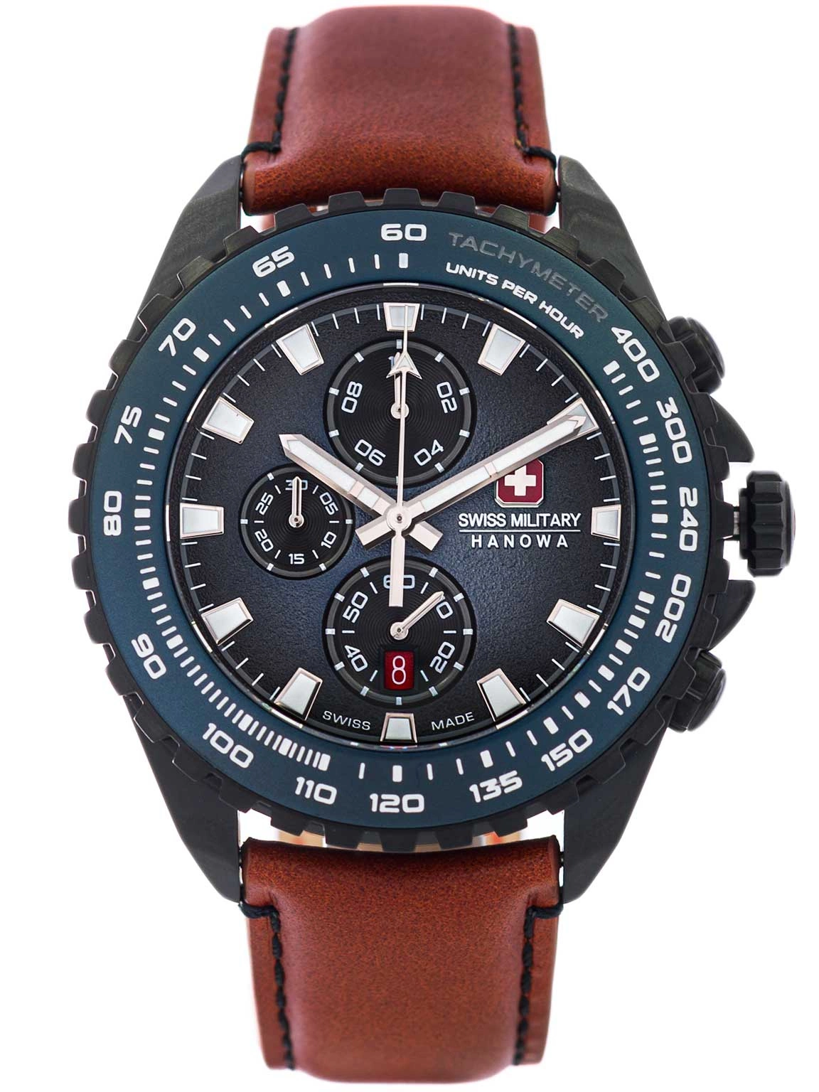 - Wodoszczelny Zegarek Męski Swiss Military Hanowa SMWGC0001831 brązowy na pasku. Posiada funkcje chronografu, datownika i neobrite.
