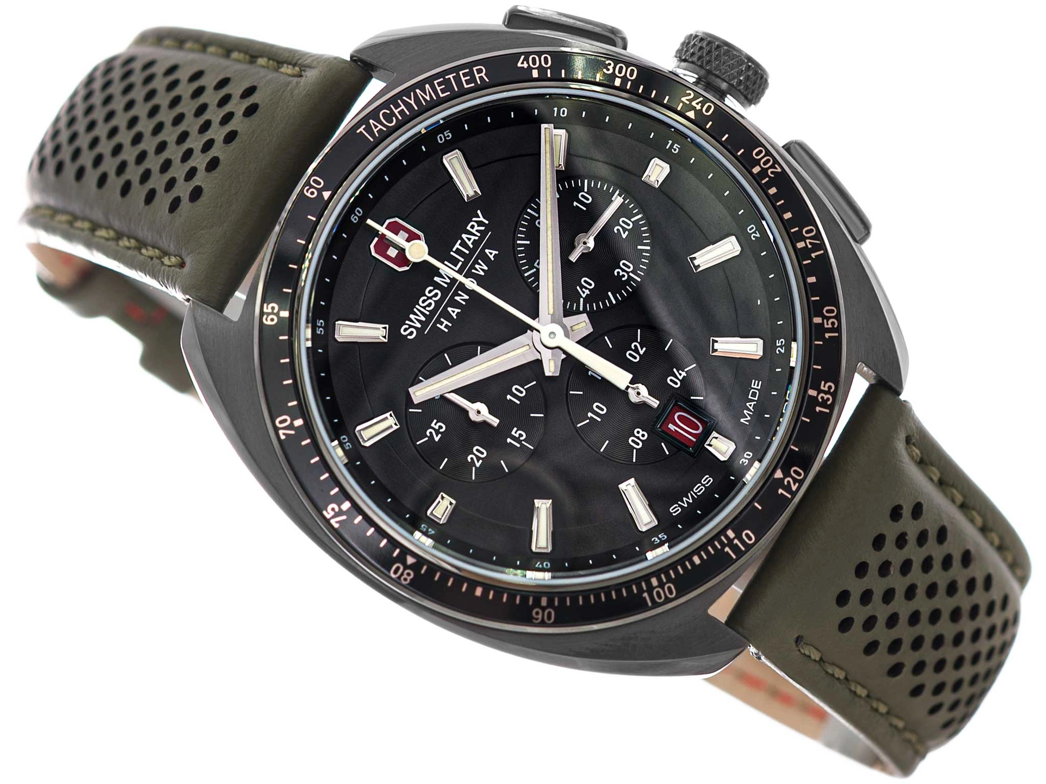 - Wodoszczelny Zegarek Męski Swiss Military Hanowa SMWGC0003340 zielony na pasku. Posiada funkcje chronografu, datownika i neobrite.