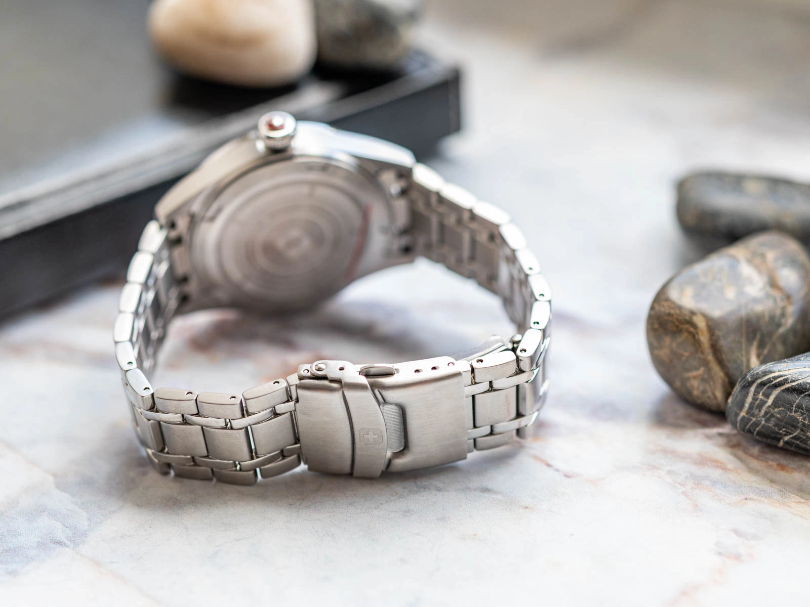- Wodoszczelny Zegarek Męski Swiss Military Hanowa SMWGH0000802 srebrny na bransolecie. Posiada funkcję datownika oraz neobrite.