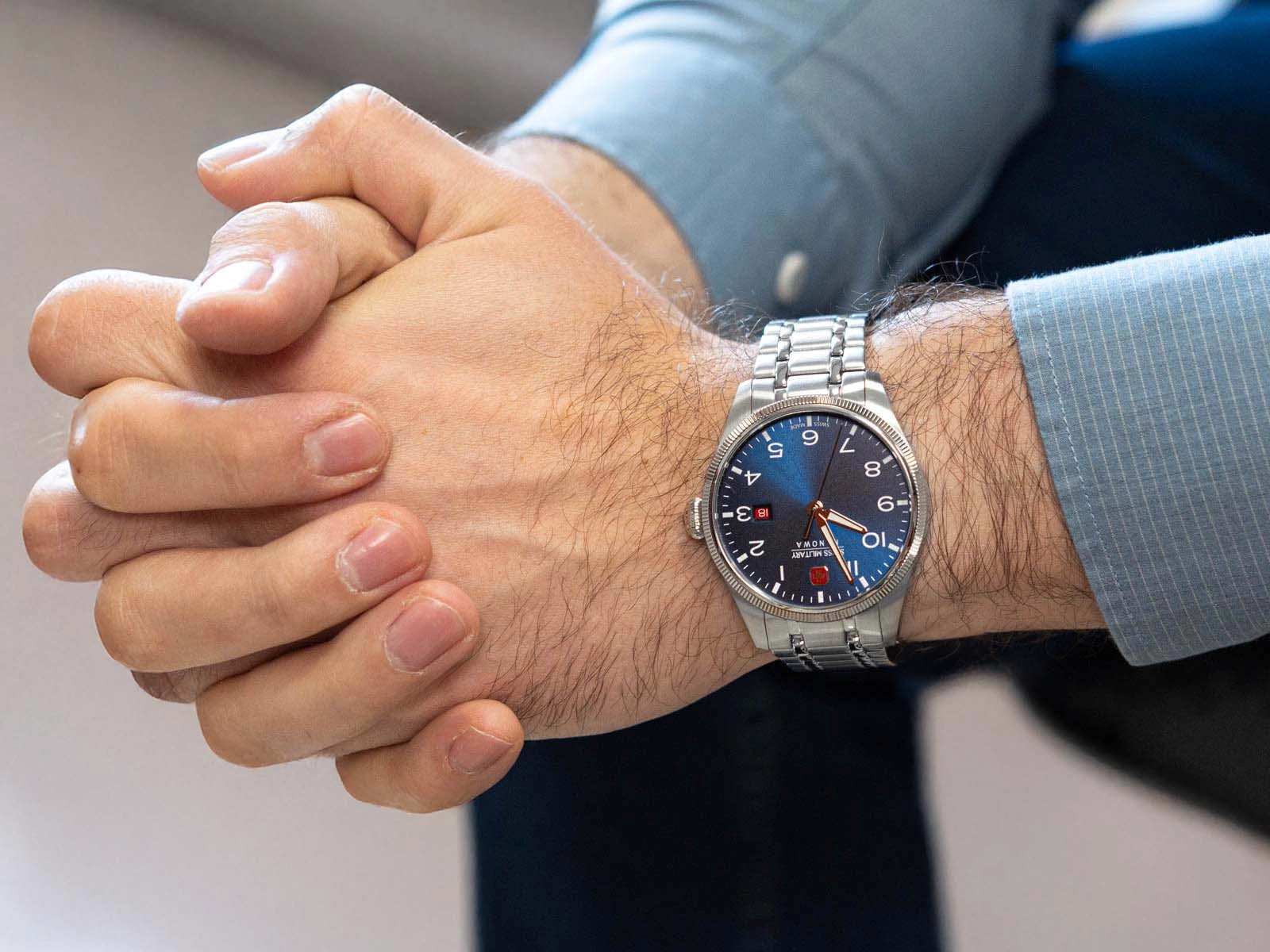 Centralnym elementem kompozycji jest granatowa tarcza o szlifie słonecznym, która subtelnie odbija światło, tworząc elegancką głębię i dynamiczny efekt w zależności od kąta padania promieni. Jasne cyfry arabskie oraz proste indeksy kontrastują wyraziście z tłem, zapewniając szybki i bezproblemowy odczyt godziny. Wskazówki oraz markery pokryte są warstwą neobrite – materiałem luminescencyjnym, który po wcześniejszym naświetleniu umożliwia wygodne korzystanie z zegarka także w ciemności. Charakterystyczne logo Swiss Military Hanowa, umieszczone na godzinie dwunastej, wyróżnia się czerwonym polem z białym krzyżem, stanowiąc nawiązanie do szwajcarskiej tradycji i wojskowego dziedzictwa marki. Praktyczny datownik ulokowany na godzinie trzeciej harmonijnie współgra z układem cyferblatu, zachowując jego symetrię i przejrzystość. Tarczę chroni odporne na zarysowania szkło szafirowe, które dzięki swojej twardości i przezroczystości zapewnia trwałość i doskonałą widoczność wskazań nawet po latach intensywnego użytkowania. Wodoszczelność na poziomie 10 ATM umożliwia swobodne korzystanie z zegarka w warunkach kontaktu z wodą – od codziennego mycia rąk po pływanie. Całość dopełnia stalowa bransoleta w kolorze srebrnym, wyposażona w praktyczne zapięcie motylkowe z dodatkowym zabezpieczeniem przed przypadkowym otwarciem. Model Swiss Military Hanowa SMWGH0000802 Thunderbolt to nie tylko narzędzie do odmierzania czasu, ale również wyraz stylu, niezawodności i męskiej siły. Jego dopracowana forma i techniczna funkcjonalność czynią go idealnym wyborem dla tych, którzy oczekują więcej – zarówno od zegarka, jak i od siebie.