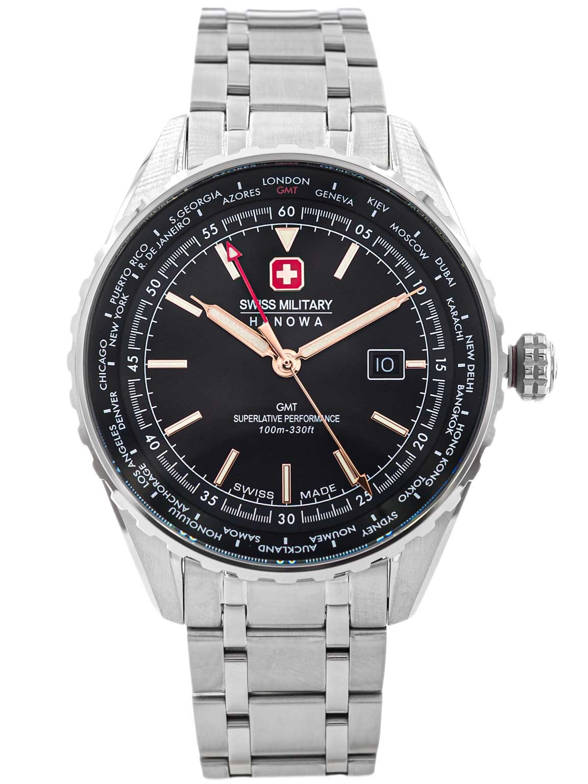 - Wodoszczelny Zegarek Męski Swiss Military Hanowa SMWGH0003203 srebrny na bransolecie. Posiada funkcję datownika, GMT oraz neobrite.
