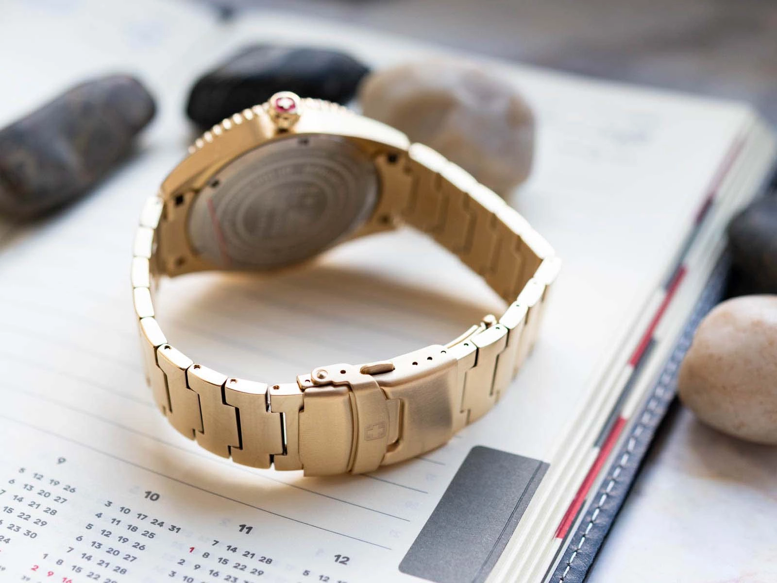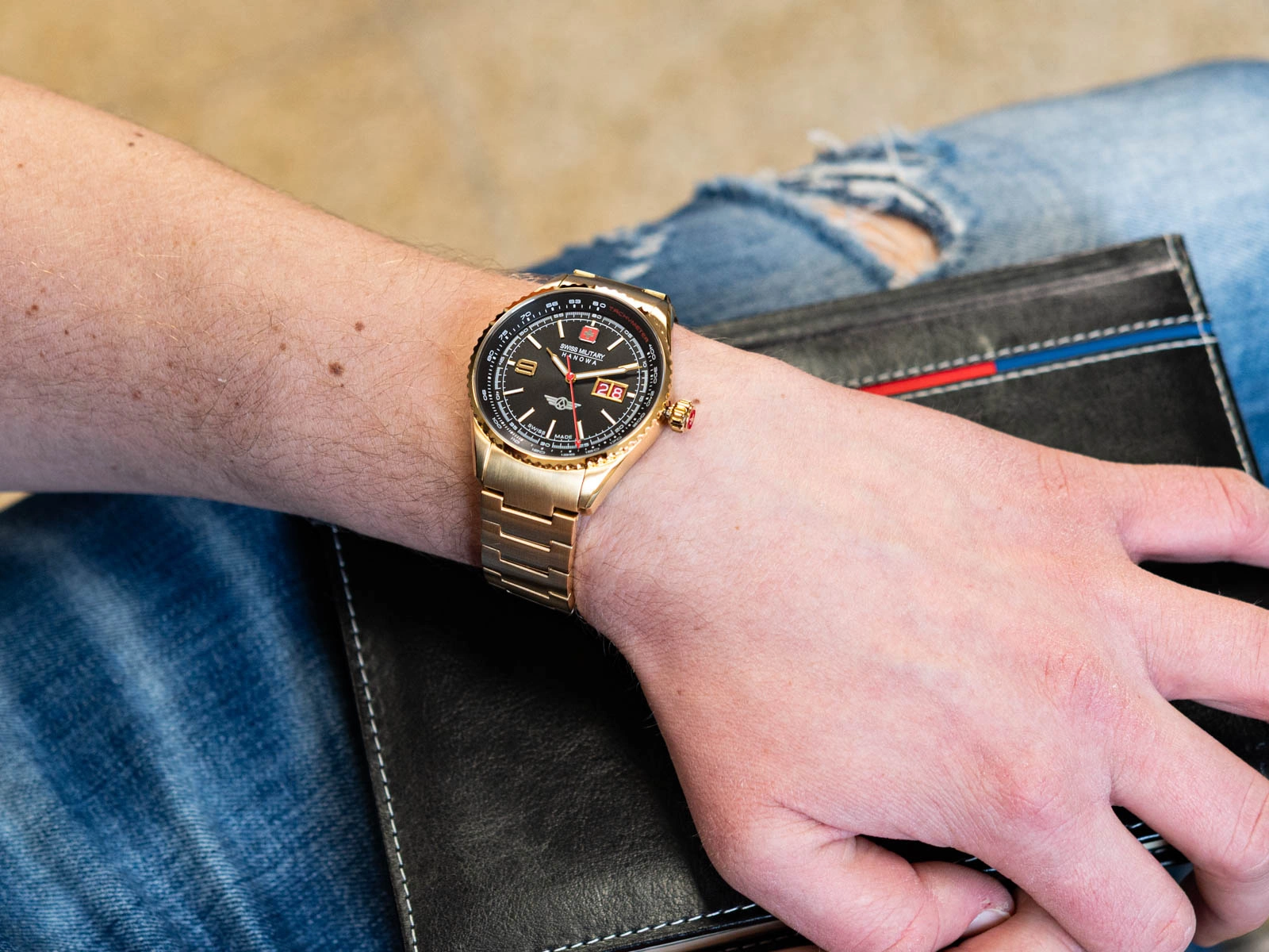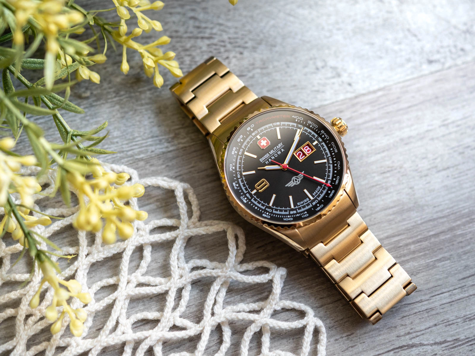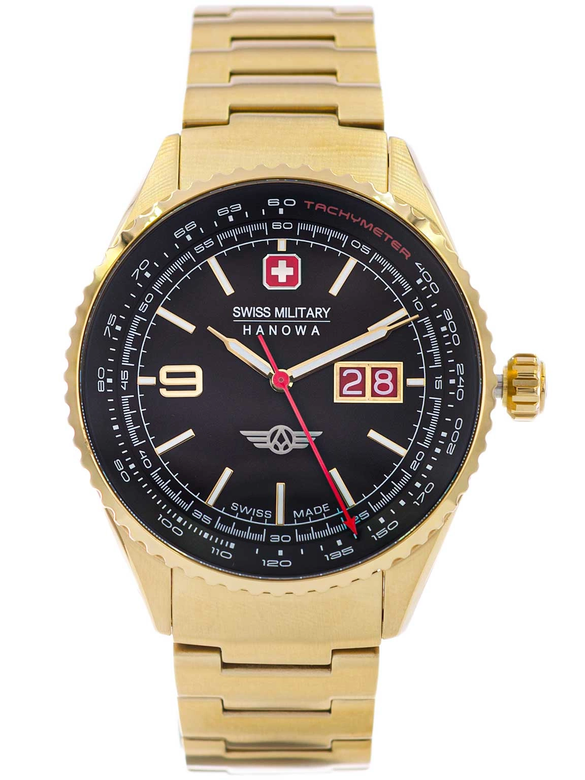 - Wodoszczelny Zegarek Męski Swiss Military Hanowa SMWGH2101010 złoty na bransolecie. Posiada funkcje datownika i neobrite.