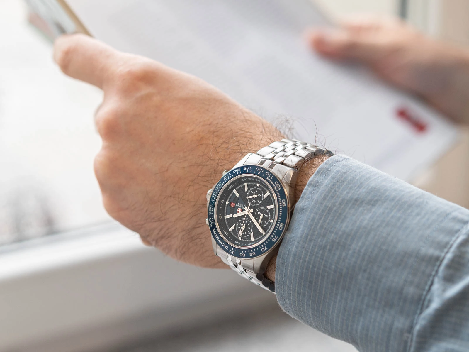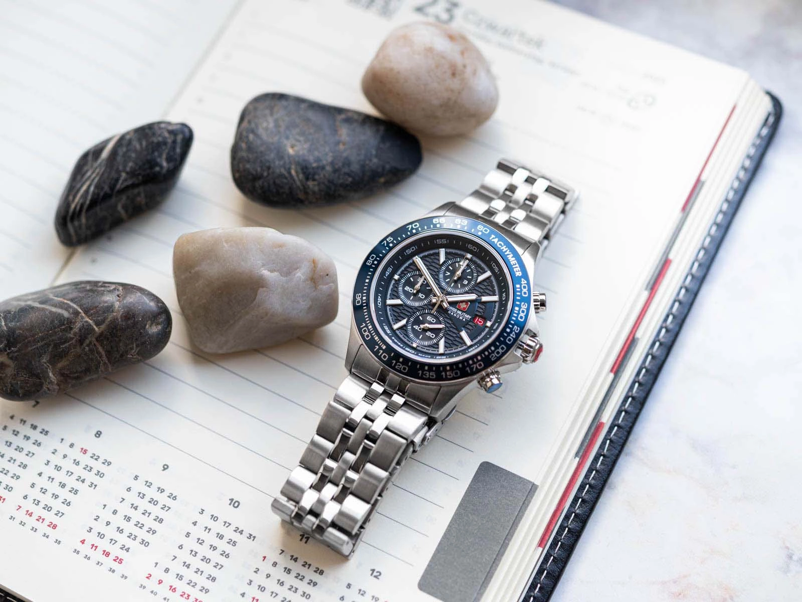 Swiss Military Hanowa SMWGI0003403 Watchman to męski zegarek, który z powodzeniem łączy dynamiczny charakter sportowego chronografu z wyważoną elegancją szwajcarskiego designu. Stworzony z myślą o aktywnych użytkownikach ceniących zarówno technologiczną precyzję, jak i wyrazistą estetykę, model ten odzwierciedla kluczowe wartości marki: funkcjonalność, solidność oraz wysoką jakość wykonania. Obudowa zegarka została wykonana z odpornej na korozję stali szlachetnej w srebrnym kolorze, z precyzyjnie wykończonymi powierzchniami o satynowym i polerowanym szlifie. Jej proporcje zostały zaprojektowane tak, by zapewnić harmonijny balans między masywnością a wygodą codziennego użytkowania. Zintegrowana bransoleta, również stalowa, ma klasyczny, spójny z kopertą profil i zakończona jest składanym zapięciem motylkowym z dodatkowym zabezpieczeniem, które stabilnie utrzymuje zegarek na nadgarstku. Model wyposażono w niezawodny szwajcarski mechanizm kwarcowy, gwarantujący precyzyjne odmierzanie czasu oraz płynne działanie funkcji dodatkowych. Centralnym elementem kompozycji jest granatowa tarcza o lekko matowej strukturze, na której rozmieszczono trzy subtarcze odpowiadające za pracę chronografu. Zastosowane indeksy i wskazówki w kolorze srebrnym zostały wyposażone w elementy pokryte powłoką luminescencyjną neobrite, co zapewnia po wcześniejszym naświetleniu czytelność także po zmroku.