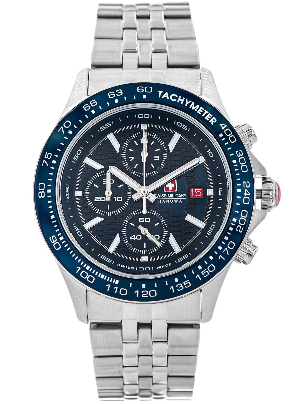 • Wodoszczelny Zegarek Męski Swiss Military Hanowa SMWGI0003403 srebrny na bransolecie. Posiada funkcje chronografu, datownika i neobrite.