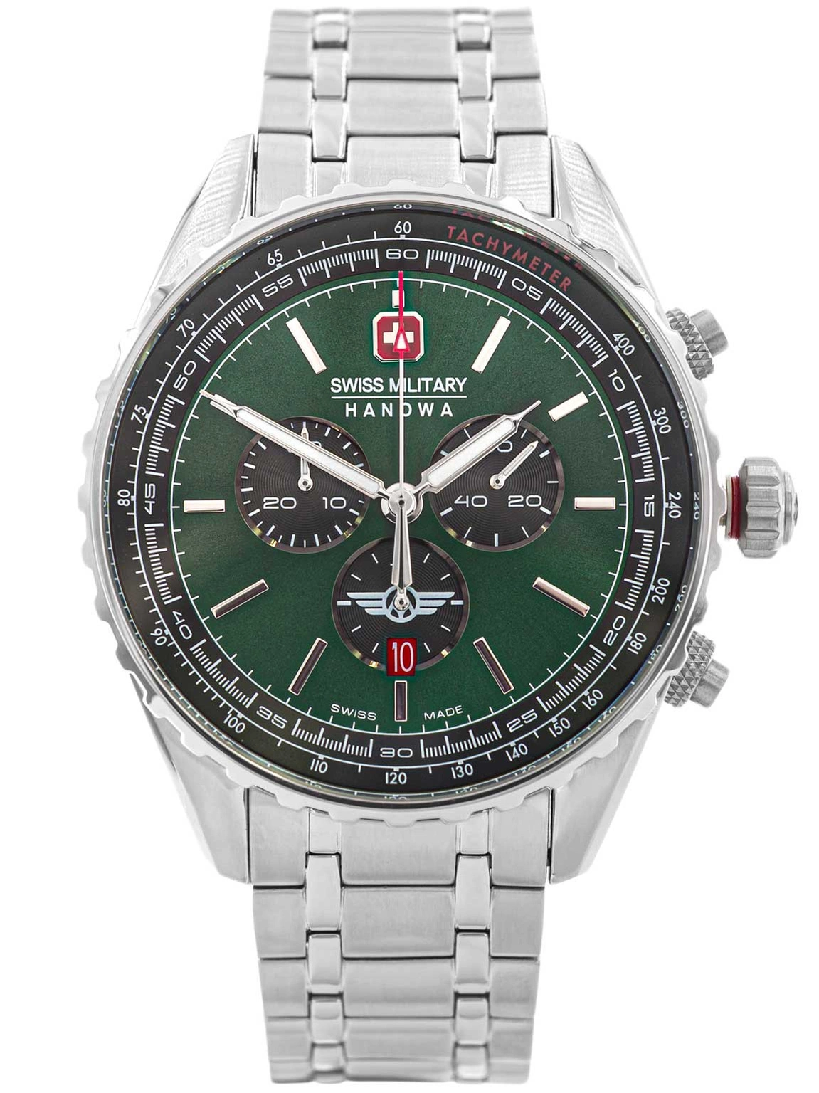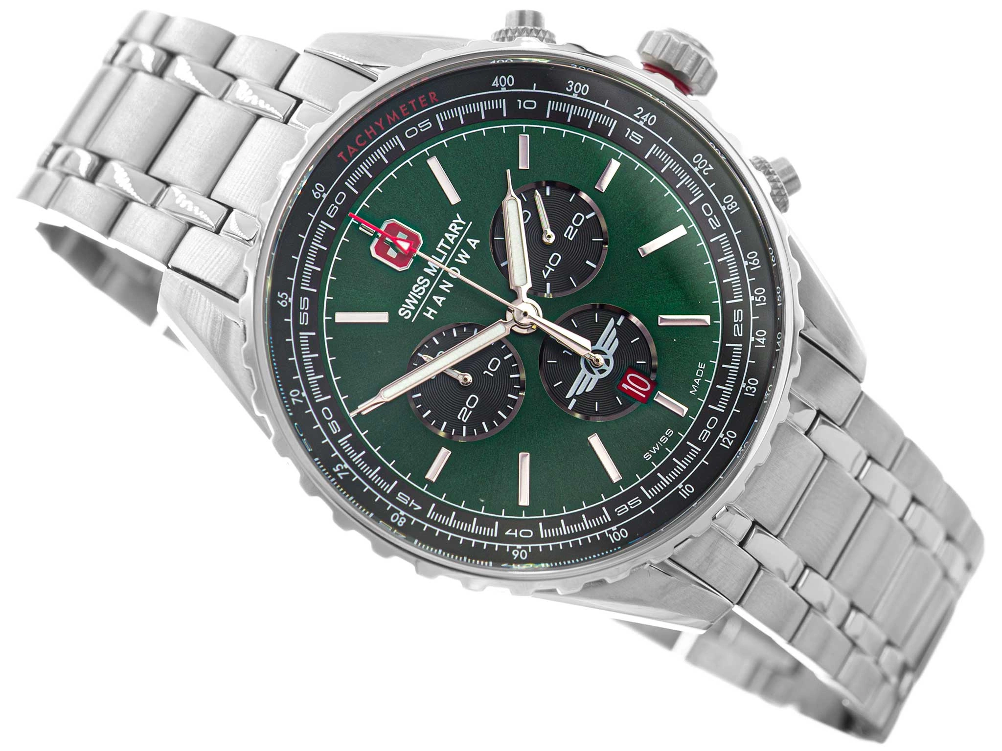 - Wodoszczelny Zegarek Męski Swiss Military Hanowa SMWGI0000307 srebrny na bransolecie. Posiada funkcje chronografu, datownika i neobrite.
