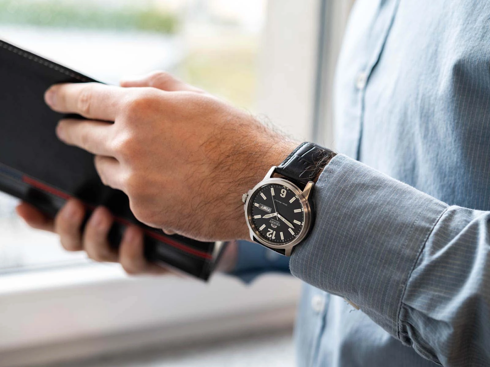 Orient RA-AA0C04B39B Contemporary Automatic to klasyczny zegarek męski, który łączy elegancję z nowoczesną funkcjonalnością. Wyposażony w niezawodny mechanizm automatyczny, z możliwością ręcznego dokręcania, działa bez potrzeby używania baterii, wykorzystując naturalny ruch nadgarstka. Solidna koperta ze stali szlachetnej w srebrnym kolorze doskonale komponuje się z czarnym skórzanym paskiem, nadając zegarkowi ponadczasowy, uniwersalny charakter. Czarna tarcza przyciąga wzrok subtelnym połyskiem, a odporne na zarysowania szkło mineralne chroni ją na co dzień. Czytelne oznaczenia godzin, z klasycznymi cyframi arabskimi przy 12 i 6 oraz smukłymi indeksami, zapewniają przejrzystość. Dodatkowo na tarczy umieszczono praktyczny datownik z dniem tygodnia i miesiąca. Dzięki powłoce luminescencyjnej wskazówki i indeksy są widoczne także w ciemności.