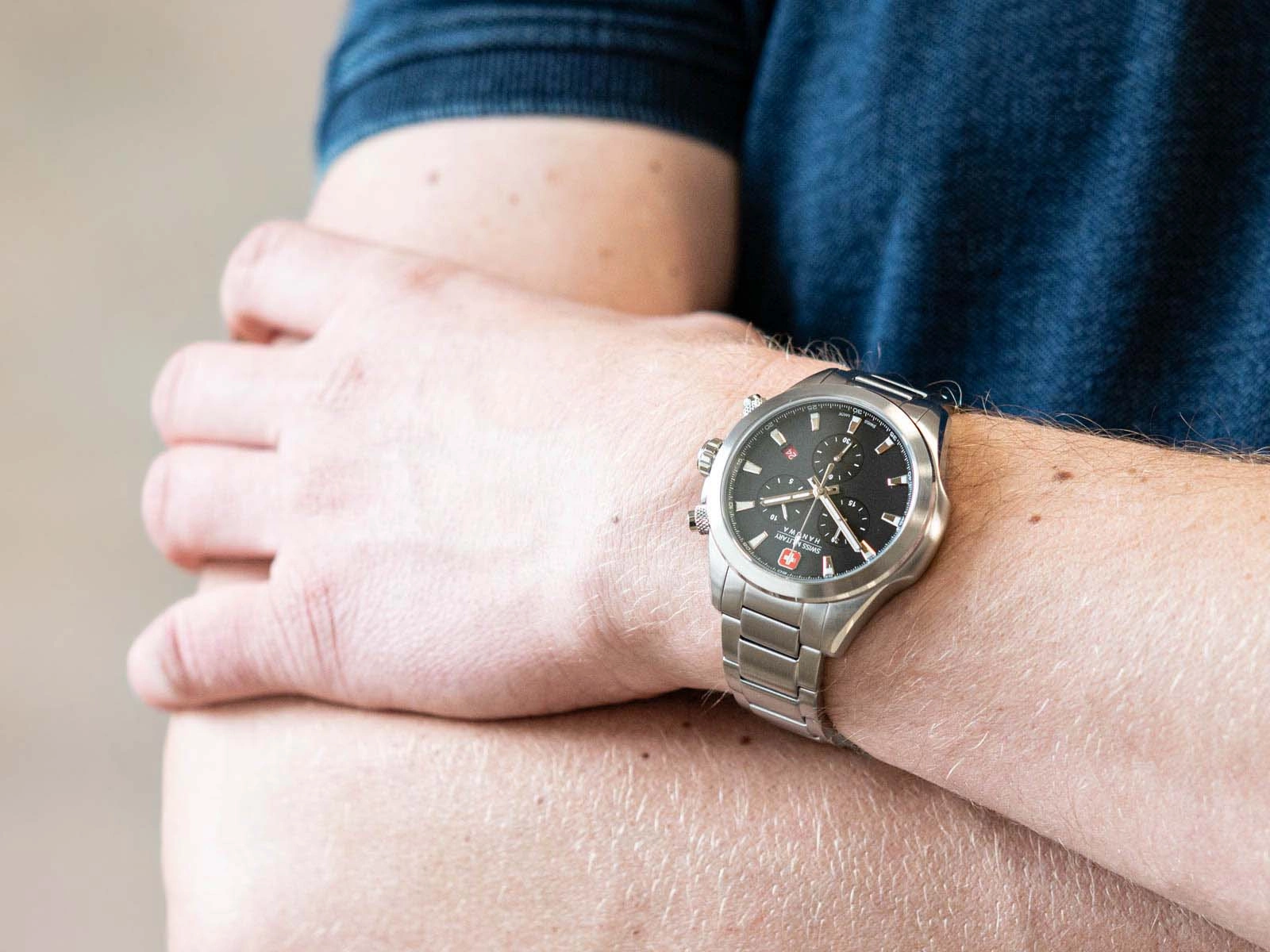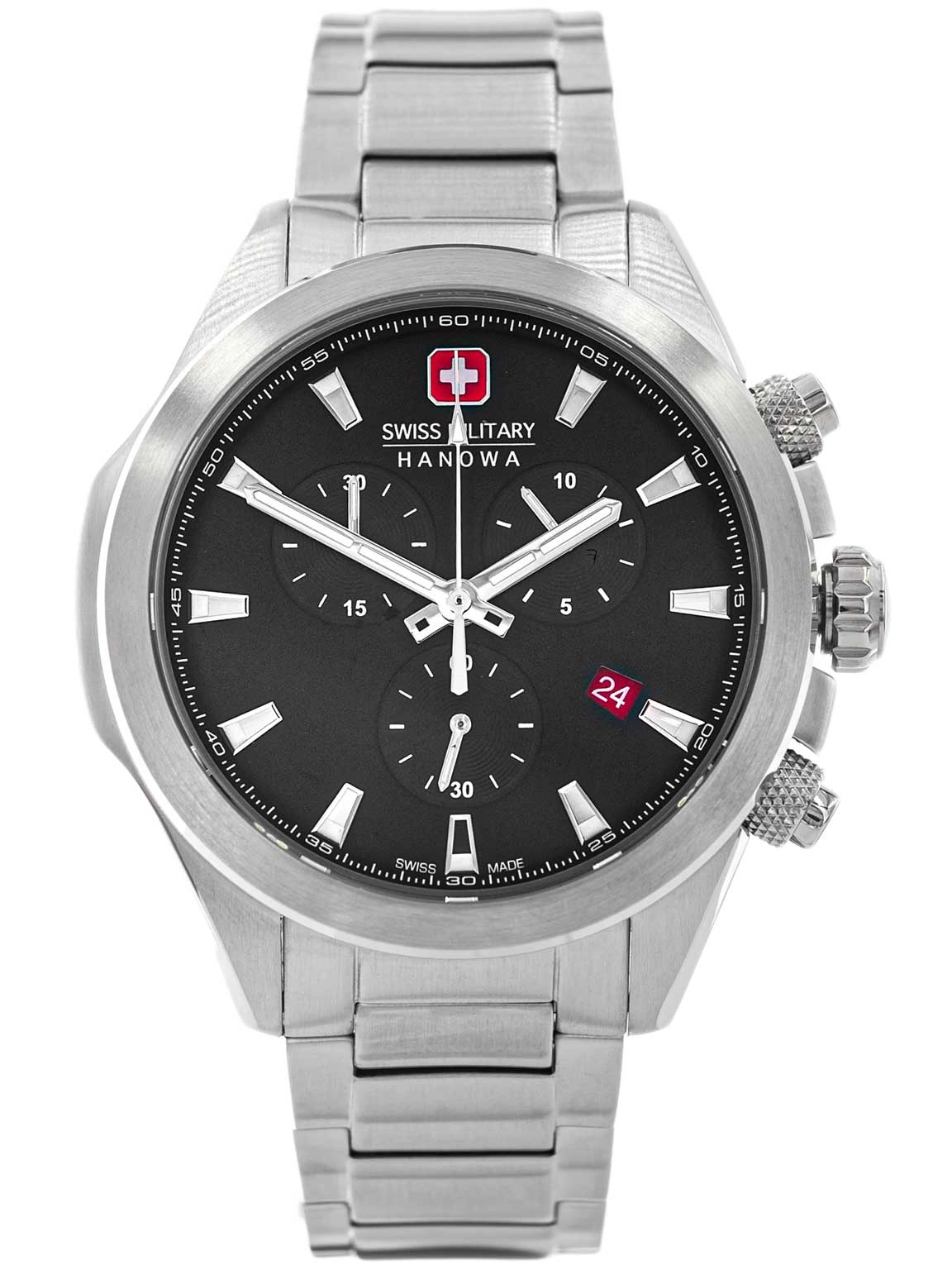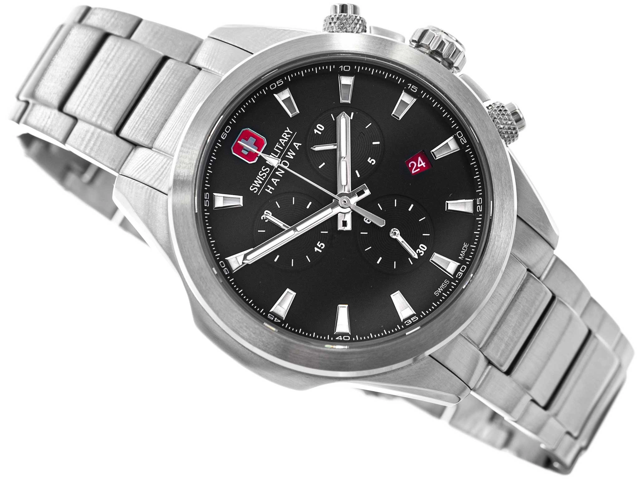 - Wodoszczelny Zegarek Męski Swiss Military Hanowa SMWGI0001901 srebrny na bransolecie. Posiada funkcje chronografu, datownika i neobrite.