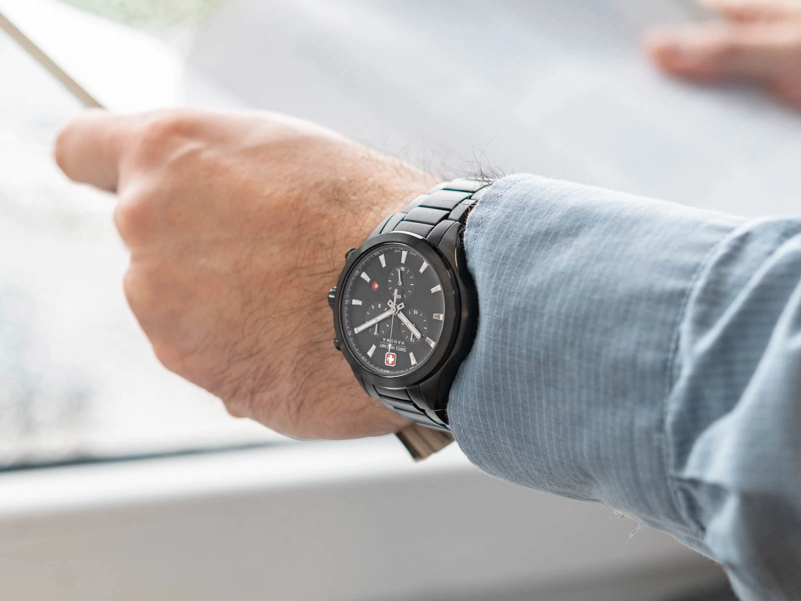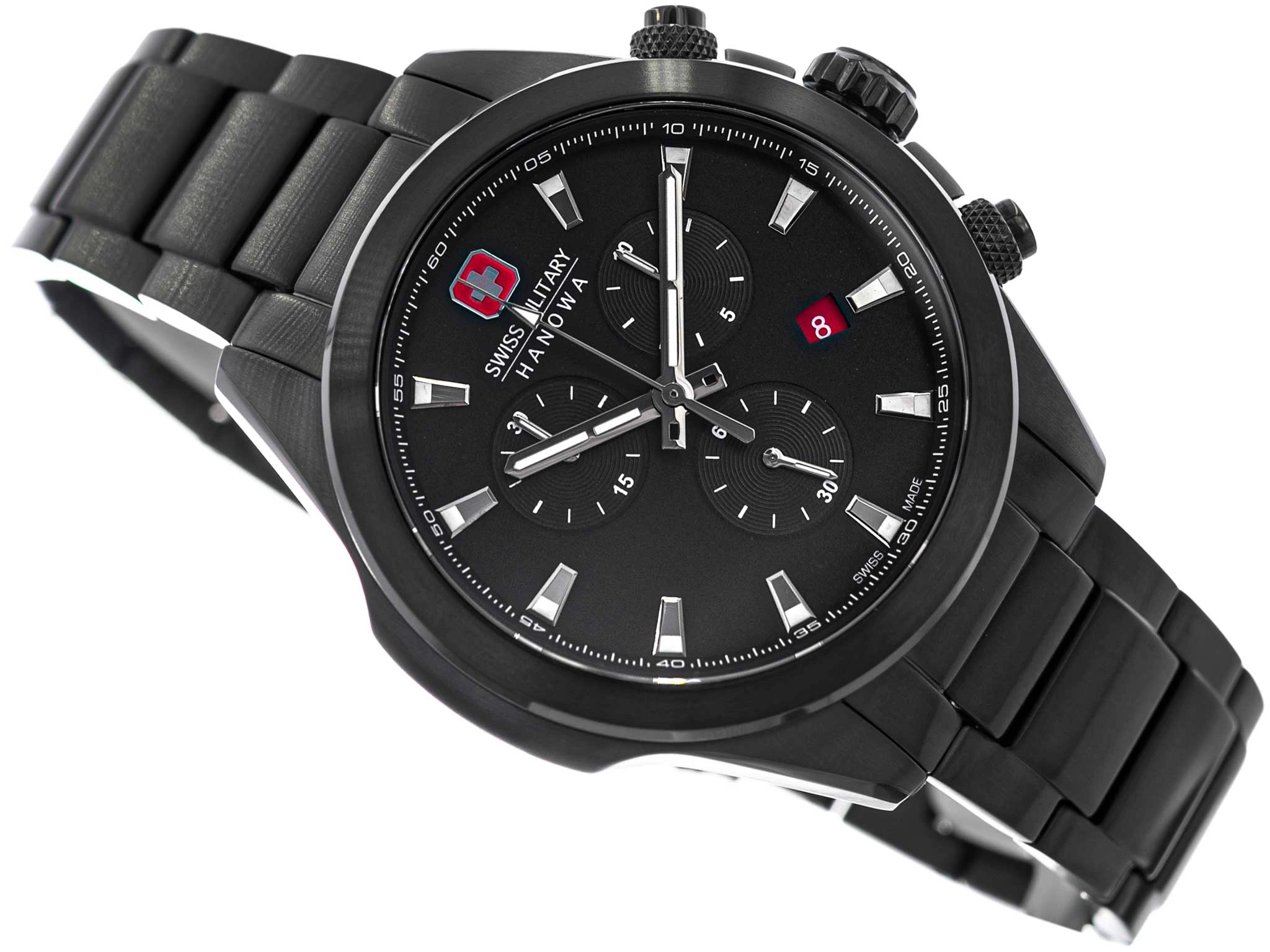 - Wodoszczelny Zegarek Męski Swiss Military Hanowa SMWGI0001930 czarny na bransolecie. Posiada funkcje chronografu, datownika i neobrite.