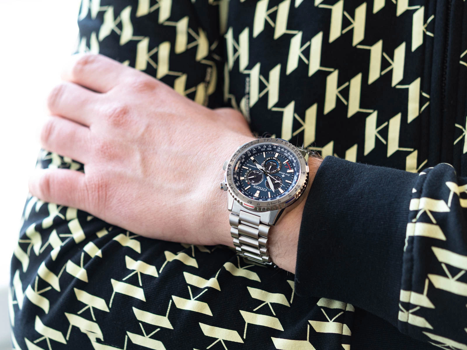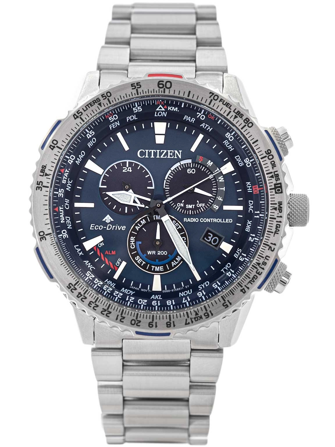 Funkcjonalność modelu Citizen CB5000-50L Promaster Sky Eco-Drive Radio-Controlled została zaprojektowana z myślą o osobach, które potrzebują niezawodnego narzędzia nie tylko do mierzenia czasu, ale i do podejmowania precyzyjnych decyzji w dynamicznych warunkach. Obrotowy dwukierunkowy bezel z naniesioną skalą pozwala na wykonywanie zaawansowanych obliczeń w trakcie lotu, co czyni ten zegarek idealnym kompanem dla pasjonatów lotnictwa i podróży. Analogowy stoper pozwala na odmierzanie czasu do 60 minut. Zintegrowany datownik umieszczony na tarczy zapewnia przejrzysty wgląd w aktualny dzień miesiąca, co w codziennym użytkowaniu okazuje się niezwykle praktyczne. Zegarek oferuje również możliwość ustawienia alarmu, dodając kolejny poziom funkcjonalności do tej już imponującej konstrukcji.