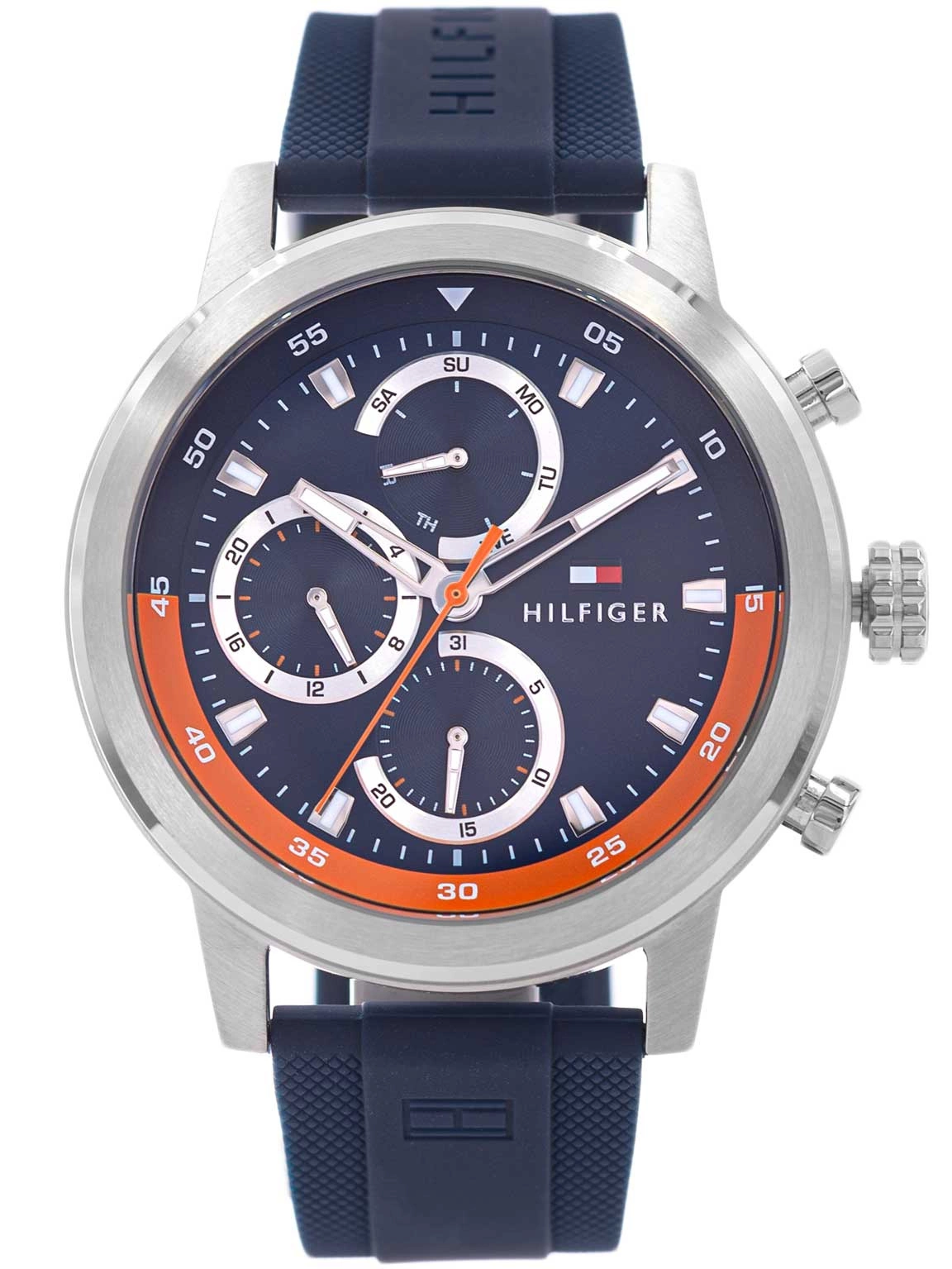 - Zegarek Męski Tommy Hilfiger 1792177 granatowy na pasku, z rozbudowanym datownikiem.