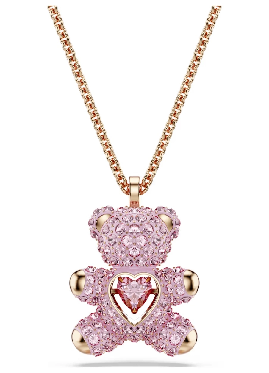 Naszyjnik damski Swarovski 5642976 Teddy to urzekająca biżuteria, która łączy w sobie dziecięcy urok z precyzyjnym jubilerskim rzemiosłem. Trójwymiarowy motyw misia został misternie pokryty jasnoróżowymi kryształkami w technice Pointiage, które zapewniają intensywny blask i wrażenie głębi. Centralnym elementem jest kamień Dancing Stone w kształcie serca, osadzony w taki sposób, by poruszać się przy każdym ruchu, podkreślając radosny charakter kompozycji. Zawieszka zawieszona została na delikatnym łańcuszku pokrytym powłoką w odcieniu różowego złota, który subtelnie podbija ciepły ton całego projektu. Naszyjnik damski Swarovski 5642976 Teddy to nie tylko ozdoba, ale także pełna wdzięku deklaracja pozytywnych emocji — idealna do dodania uśmiechu codziennym stylizacjom.