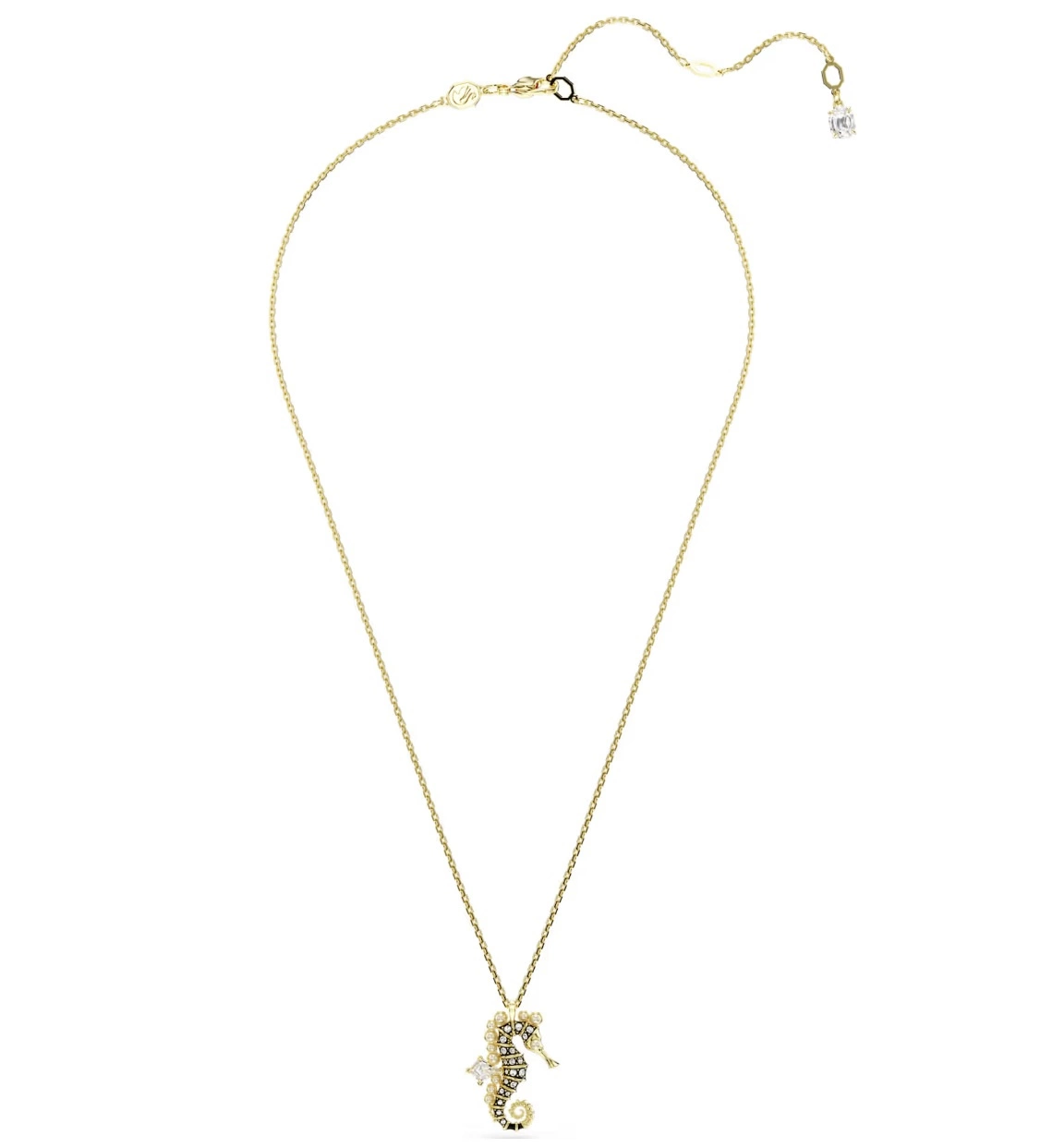 Naszyjnik damski Swarovski 5690874 Idyllia to biżuteria, która w niezwykle finezyjny sposób oddaje piękno podwodnego świata. Wisiorek w kształcie konika morskiego został misternie skomponowany z kryształowych pereł, bezbarwnych kryształów i cyrkonii Swarovskiego w odcieniu White, tworząc efekt pełen delikatnego połysku i organicznej lekkości. Złociste detale nadają kompozycji szlachetnego charakteru, podkreślając artystyczny kunszt wykonania. Całość zawieszona jest na subtelnym łańcuszku, który dyskretnie dopełnia całość, nie odciągając uwagi od bogatego wzoru. Naszyjnik damski Swarovski 5690874 Idyllia przywołuje skojarzenia z morskimi opowieściami i stanowi wyjątkową ozdobę, która może stać się symbolicznym amuletem codziennej przygody.