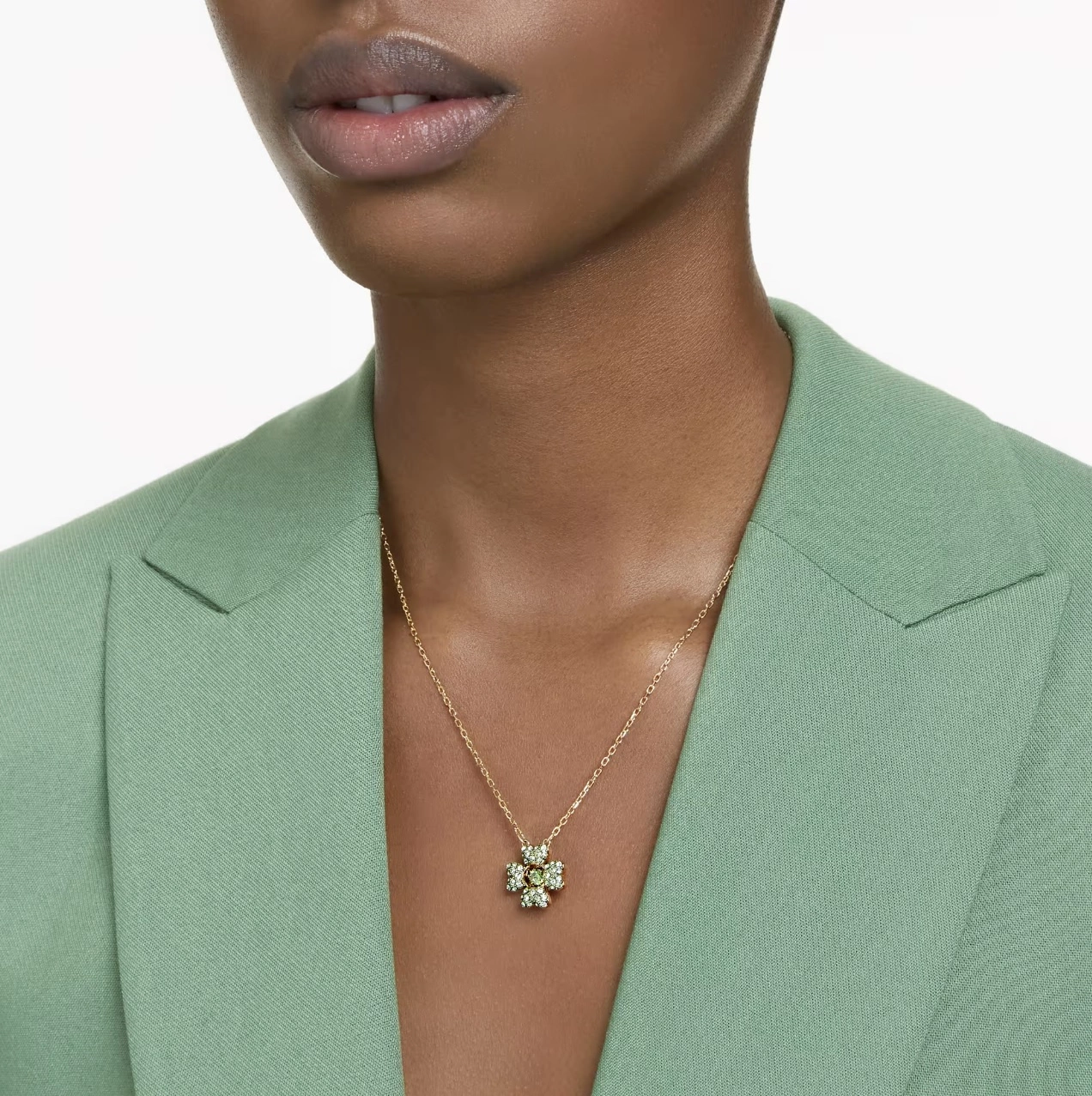 Naszyjnik damski Swarovski 5671144 Idyllia emanuje świeżością i wyrafinowaniem, łącząc symbolikę natury z precyzją szlachetnego rzemiosła. Motyw czterolistnej koniczyny został zinterpretowany w zaskakująco elegancki sposób — każdy listek tworzy zielona cyrkonia Swarovskiego w szlifie serca, otaczająca centralnie umieszczony kamień Dancing Stone, który delikatnie porusza się przy każdym ruchu. Całość osadzono na finezyjnym łańcuszku pokrytym powłoką w odcieniu złota, dzięki czemu naszyjnik przyciąga uwagę subtelnym blaskiem i harmonią form. Naszyjnik damski Swarovski 5671144 Idyllia to nie tylko stylowy dodatek, ale również osobisty amulet, w którym lekkość natury spotyka się z luksusowym wykończeniem.