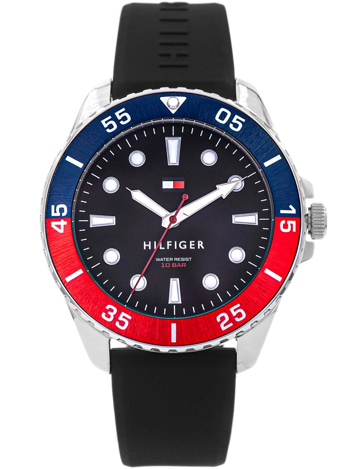 Tommy Hilfiger OCEANIC 1792201 to nowoczesny zegarek męski, który doskonale balansuje między sportową dynamiką a eleganckim designem. Stworzony z myślą o mężczyznach ceniących styl i funkcjonalność, wyróżnia się solidnym wykonaniem oraz komfortem noszenia na co dzień. Model wyposażony został w trwały, czarny pasek wykonany z elastycznego silikonu, który idealnie przylega do nadgarstka i zapewnia wygodę nawet podczas intensywnego użytkowania. Okrągła koperta ze stali szlachetnej, uzupełniona efektownym bezelem w dwóch kolorach, dodaje całości nowoczesnego, męskiego charakteru.