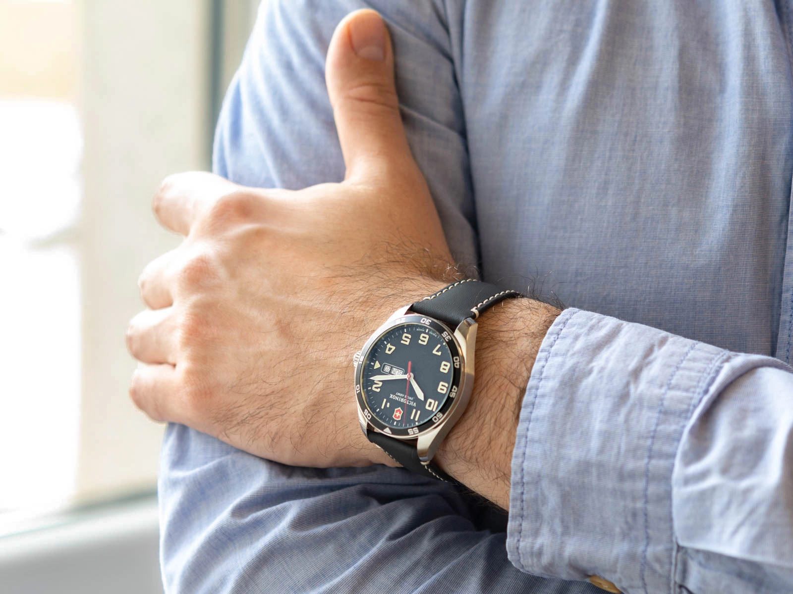 Tarcza chroniona jest przez odporne na zarysowania szkło szafirowe, które dodatkowo pokryto powłoką antyrefleksyjną. Dzięki temu możliwy jest bezproblemowy odczyt godziny nawet przy intensywnym świetle słonecznym lub sztucznym oświetleniu. Całość konstrukcji jest zabezpieczona zakręcanym deklem, który zwiększa szczelność obudowy. Zegarek spełnia normy wodoszczelności do 100M, co pozwala na swobodne korzystanie z zegarka w takcie aktywności związanych z wodą. Model Victorinox 241846 Fieldforce osadzono na czarnym pasku wykonanym z naturalnej skóry, którego faktura i subtelne przeszycia nadają całości eleganckiego wykończenia. Pasek jest trwały, a z czasem dopasowuje się do kształtu nadgarstka, zapewniając komfort nawet podczas całodziennego noszenia. Sprzączka ze stali nierdzewnej sygnowana logo marki pozwala na szybkie i pewne zapięcie zegarka, co sprawdza się zwłaszcza w sytuacjach wymagających dynamiki ruchu.