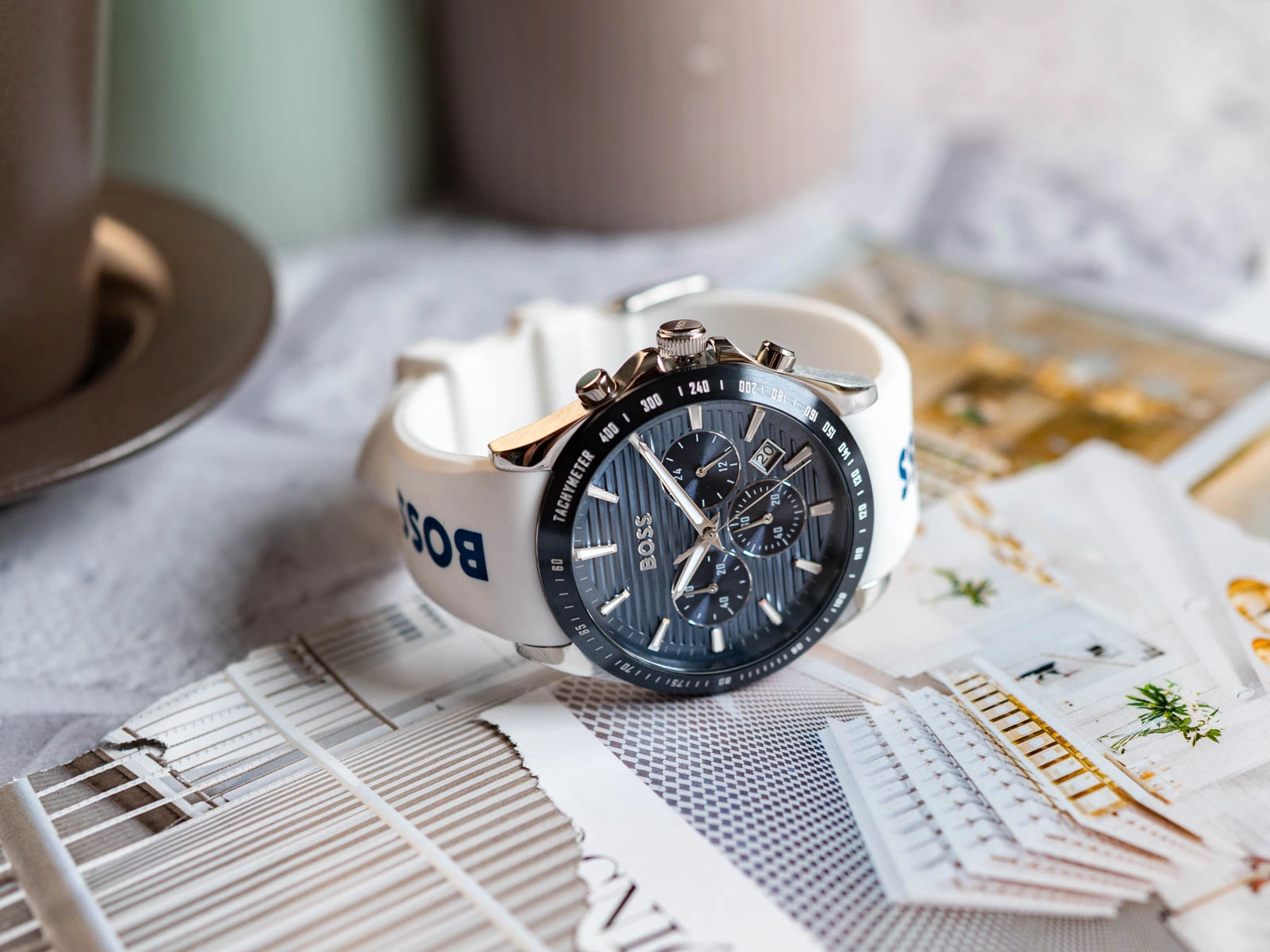 - Zegarek Męski Hugo Boss 1514238 biały na pasku, posiada funkcje takie jak stoper i datownik.