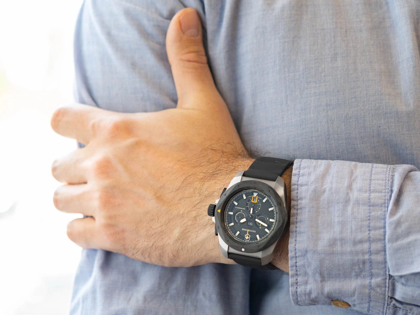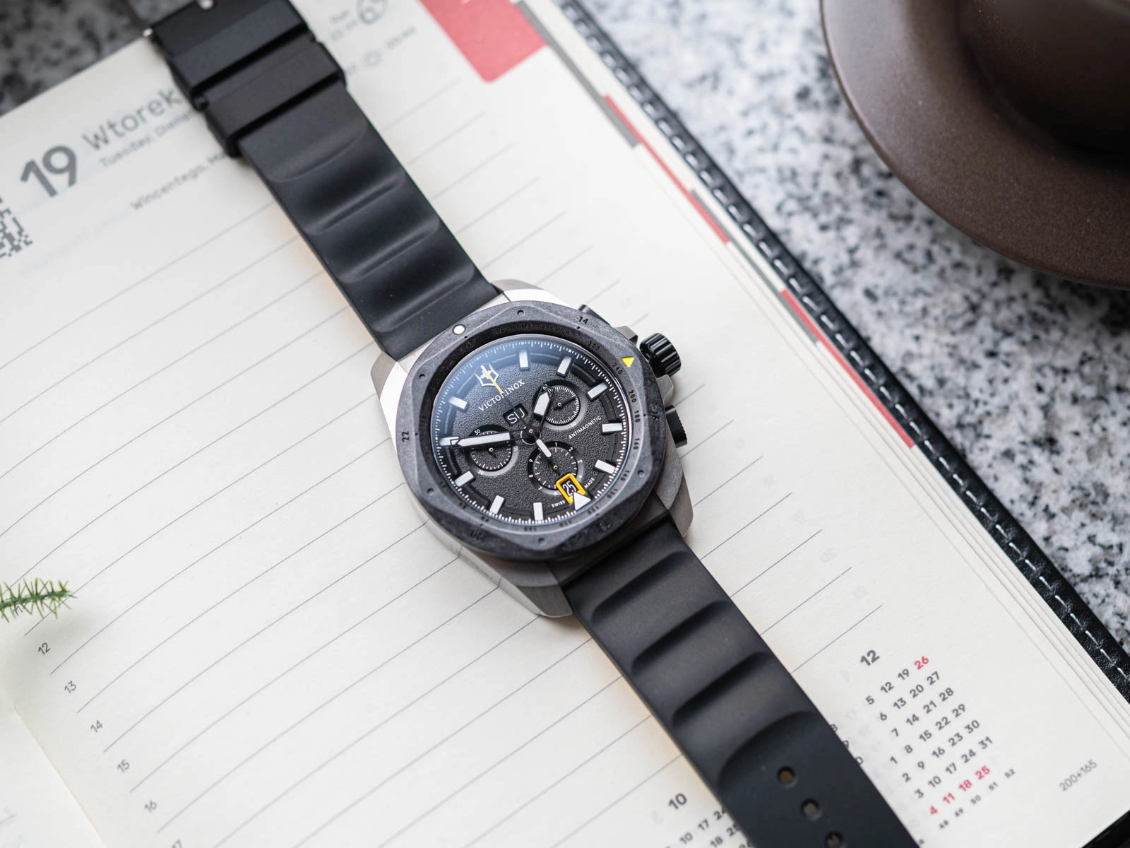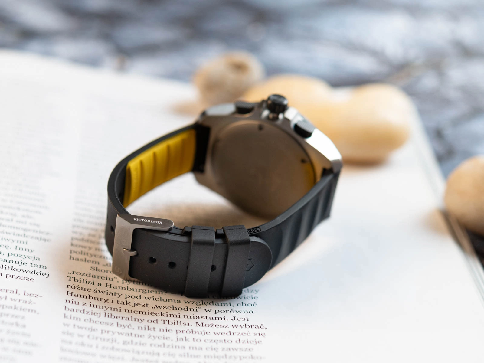 Victorinox 242011 INOX Chrono to wyraz doskonałego połączenia szwajcarskiej niezawodności, zaawansowanej funkcjonalności i nowoczesnego designu. Ten czasomierz został stworzony z myślą o osobach, które wymagają od zegarka czegoś więcej niż tylko odmierzania czasu – towarzysza codziennych wyzwań, niezależnie od tego, czy poruszasz się po zatłoczonych ulicach miasta, czy stawiasz czoła przygodom w terenie. Centralnym punktem zegarka jest piaskowana tarcza w kolorze głębokiej czerni, na której harmonijnie rozmieszczono trzy subtarcze chronografu oraz dyskretny datownik. Dzięki zastosowaniu powłoki luminescencyjnej na indeksach i wskazówkach, odczyt godziny jest intuicyjny nawet w całkowitych ciemnościach. Charakterystyczne logo Victorinox, umieszczone tuż pod godziną 12, stanowi nie tylko detal ozdobny, lecz także potwierdzenie najwyższej jakości wykonania i prestiżu szwajcarskiego producenta. Wytrzymała koperta zegarka została wykonana z lekkiego, a jednocześnie niezwykle odpornego tytanu. Dodatkowe wzmocnienie w postaci karbonowego bezela zapewnia dodatkową ochronę przy zachowaniu eleganckiego, sportowego charakteru. Ergonomiczne przyciski chronografu oraz zakręcana koronka pozwalają na sprawną obsługę funkcji, a wodoszczelność na poziomie 200m sprawia, że zegarek sprawdzi się również podczas intensywnych aktywności wodnych.Zegarek osadzono na czarnym pasku wykonanym z elastycznego kauczuku, który idealnie dopasowuje się do nadgarstka i zapewnia maksymalny komfort noszenia nawet przez cały dzień. Jego neutralny kolor doskonale komponuje się z chłodnym odcieniem stalowej koperty, tworząc nowoczesną, uniwersalną całość.