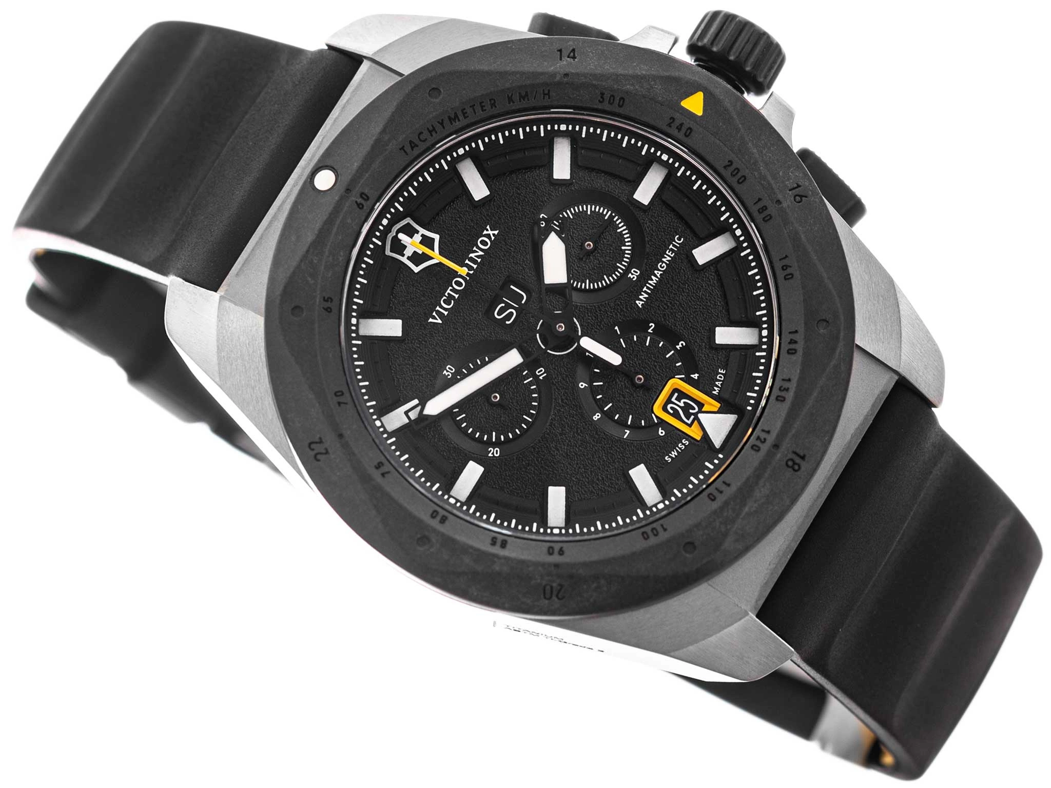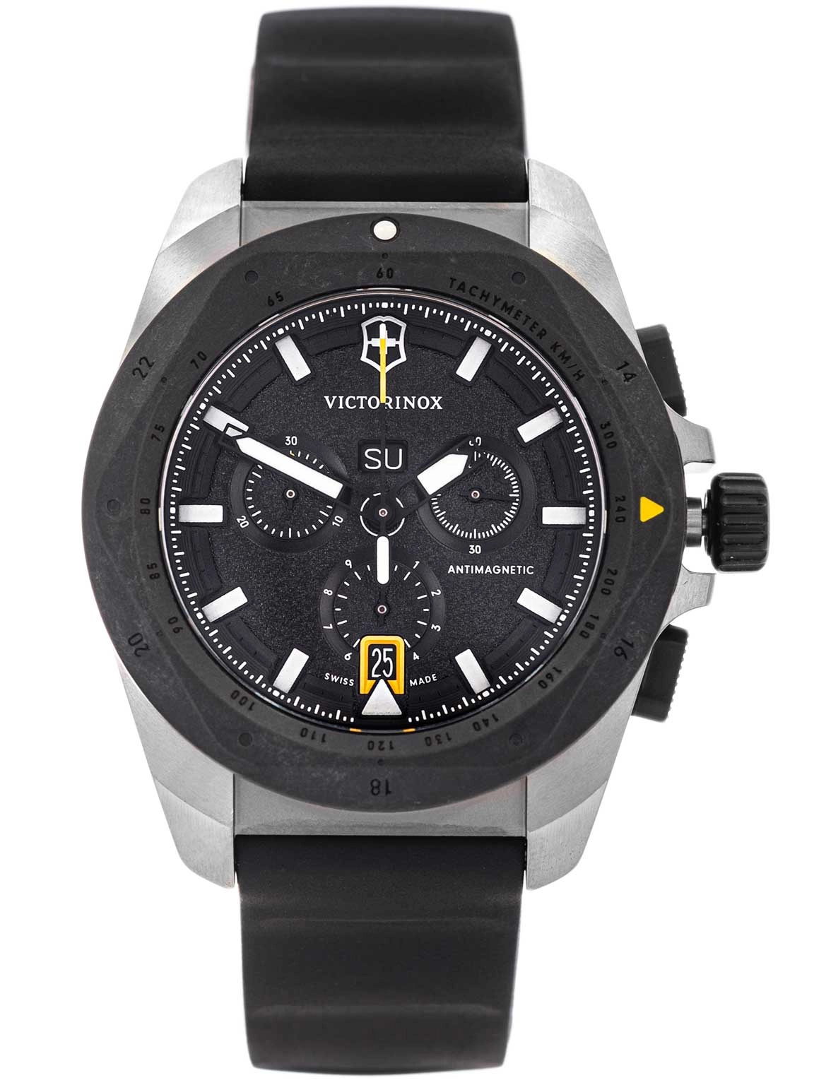 - Wodoszczelny Zegarek Męski Victorinox 242011 czarny na pasku. Posiada funkcję datownika, chronografu oraz neobrite.