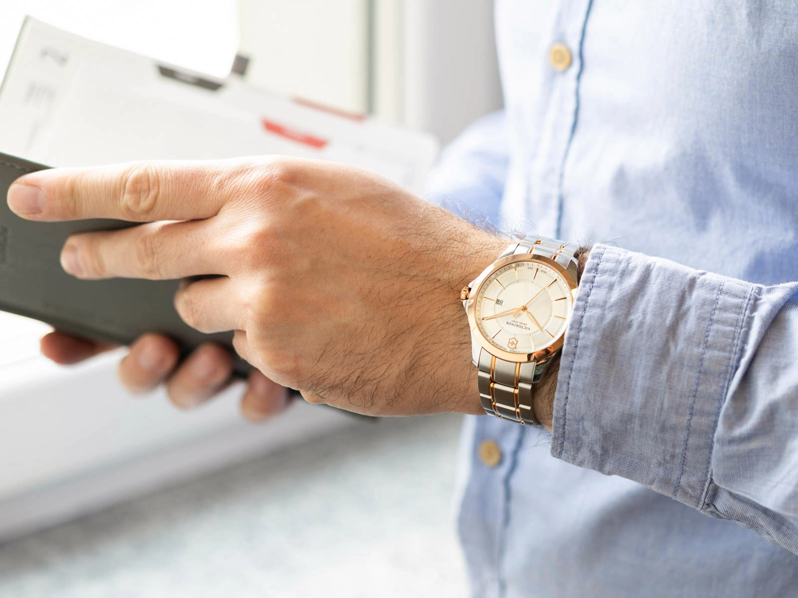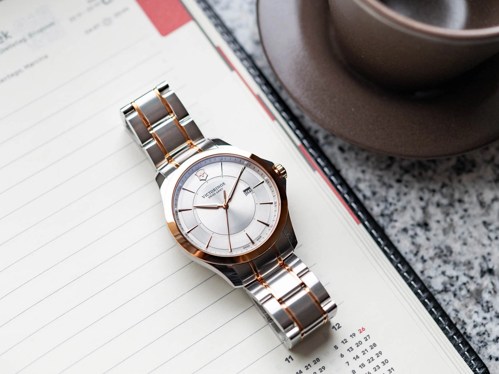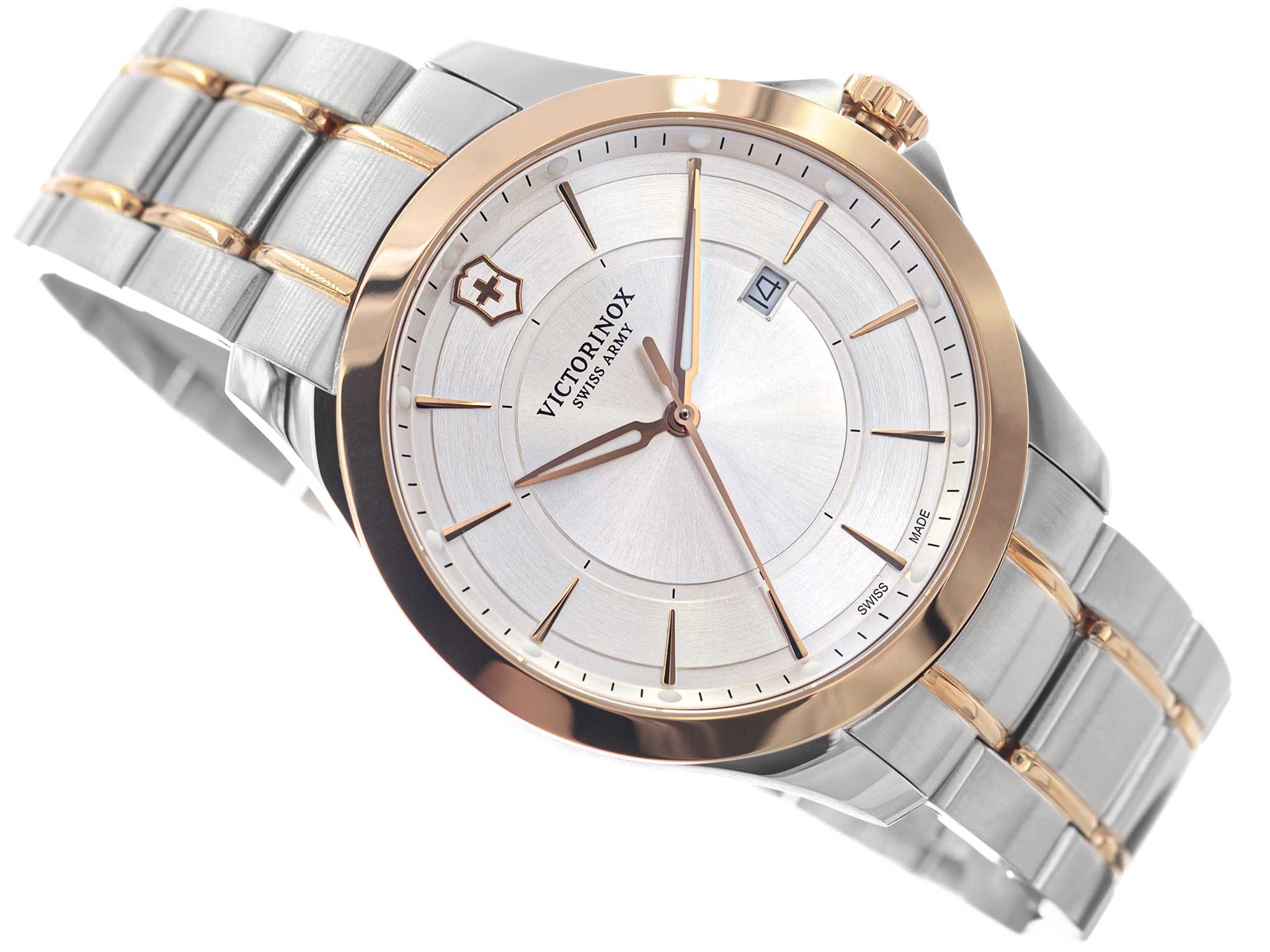 - Wodoszczelny Zegarek Męski Victorinox Alliance 241912 srebrno-różowe złoto na bransolecie. Posiada funkcję datownika oraz neobrite.