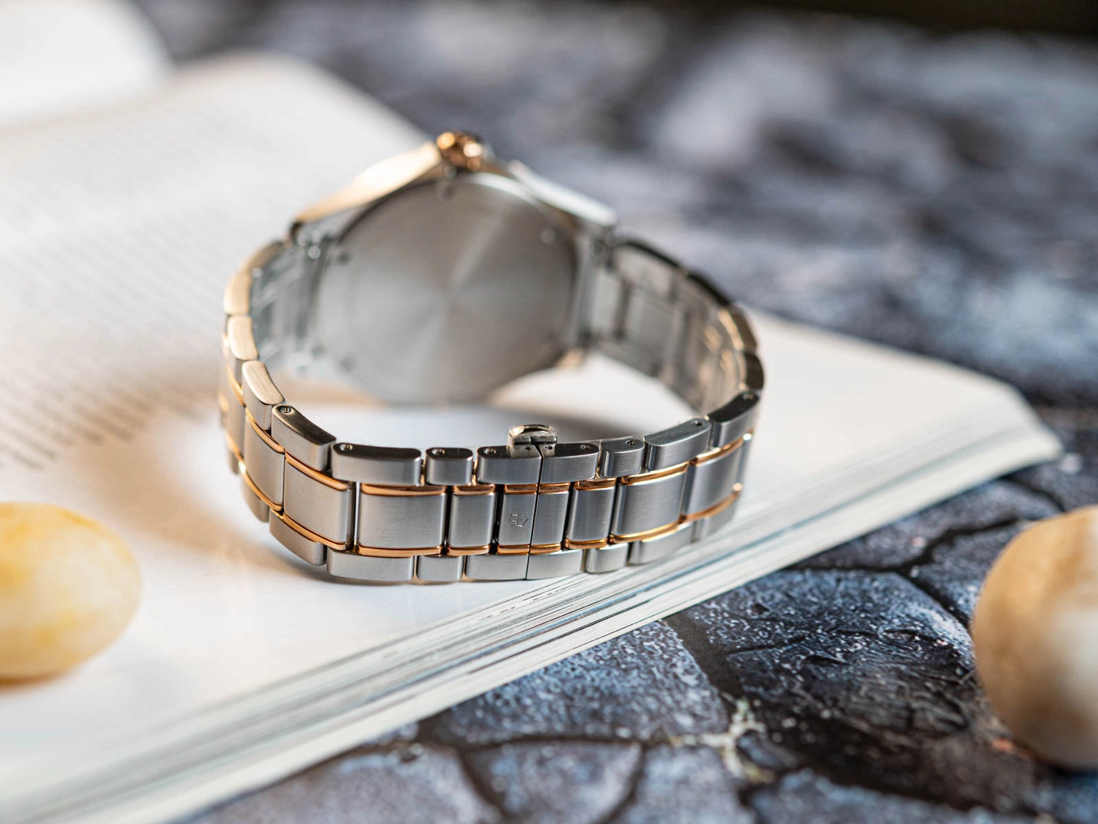 Koperta wykonana została z odpornej na korozję stali szlachetnej, będącej standardem jakości w zegarmistrzostwie premium. Jej średnica i proporcje zostały dobrane tak, aby zachować uniwersalność użytkowania — sprawdzi się zarówno w oficjalnych zestawieniach, jak i w codziennym stylu. Powierzchnia obudowy została starannie wykończona – szczotkowane boczne powierzchnie kontrastują z subtelnie wypolerowanym pierścieniem okalającym tarczę. Ochronę cyferblatu powierzono szkłu szafirowemu z powłoką antyrefleksyjną, które gwarantuje wyjątkową odporność na zarysowania i idealną przejrzystość. Na uwagę zasługuje również bransoleta – dwukolorowa kompozycja srebra i różowego złota tworzy efektowny, ale nieprzesadzony kontrast. Stalowe ogniwa są precyzyjnie spasowane, a ich ergonomiczna forma zapewnia wysoki komfort noszenia. Zastosowane zapięcie motylkowe skutecznie zapobiega przypadkowemu rozpięciu i stanowi rozwiązanie godne klasy zegarka, którego forma musi iść w parze z funkcjonalnością.