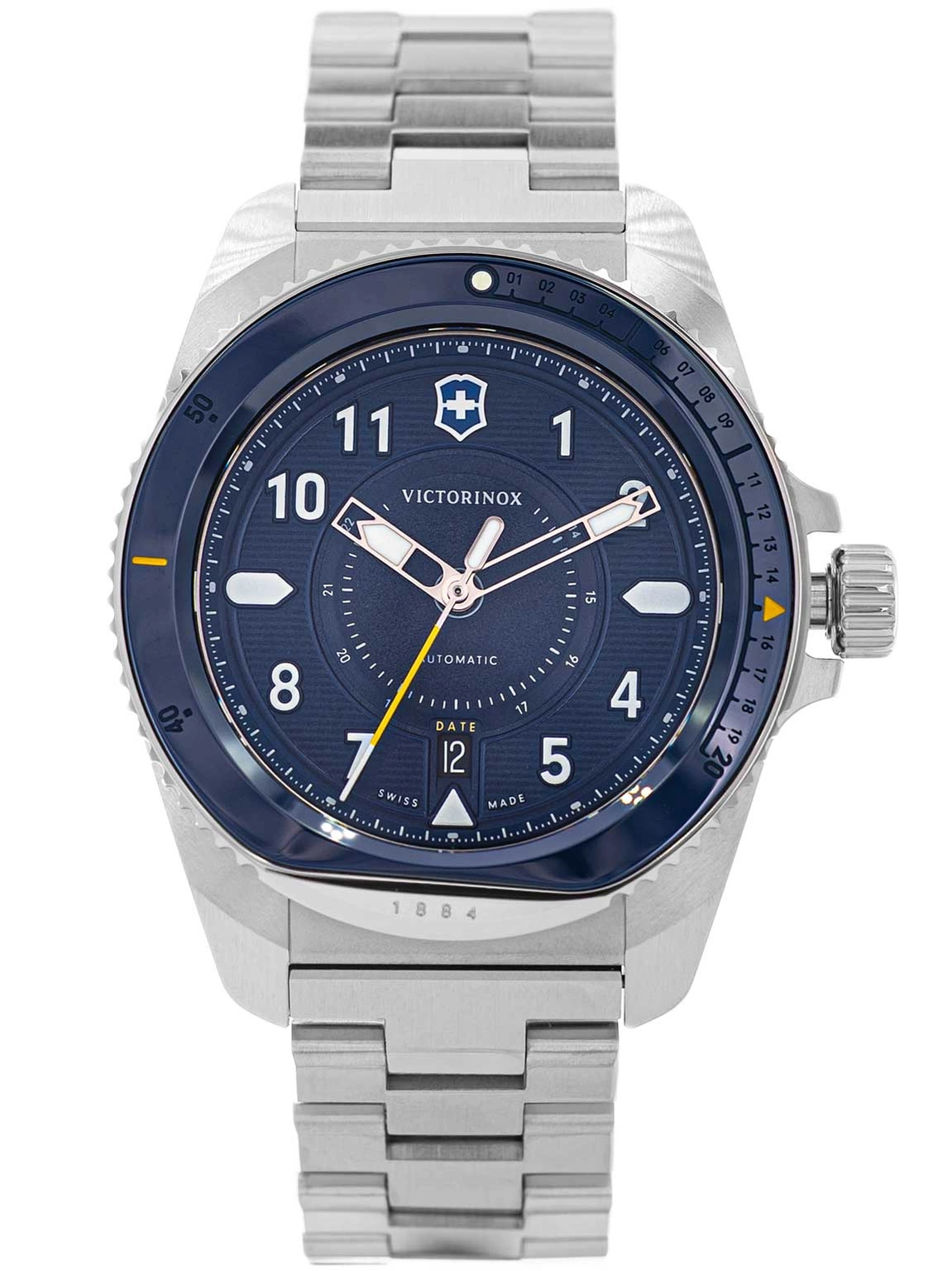 • Wodoszczelny Zegarek Męski Victorinox Journey 1884 242010 srebrny na bransolecie. Posiada funkcję datownika oraz neobrite.
