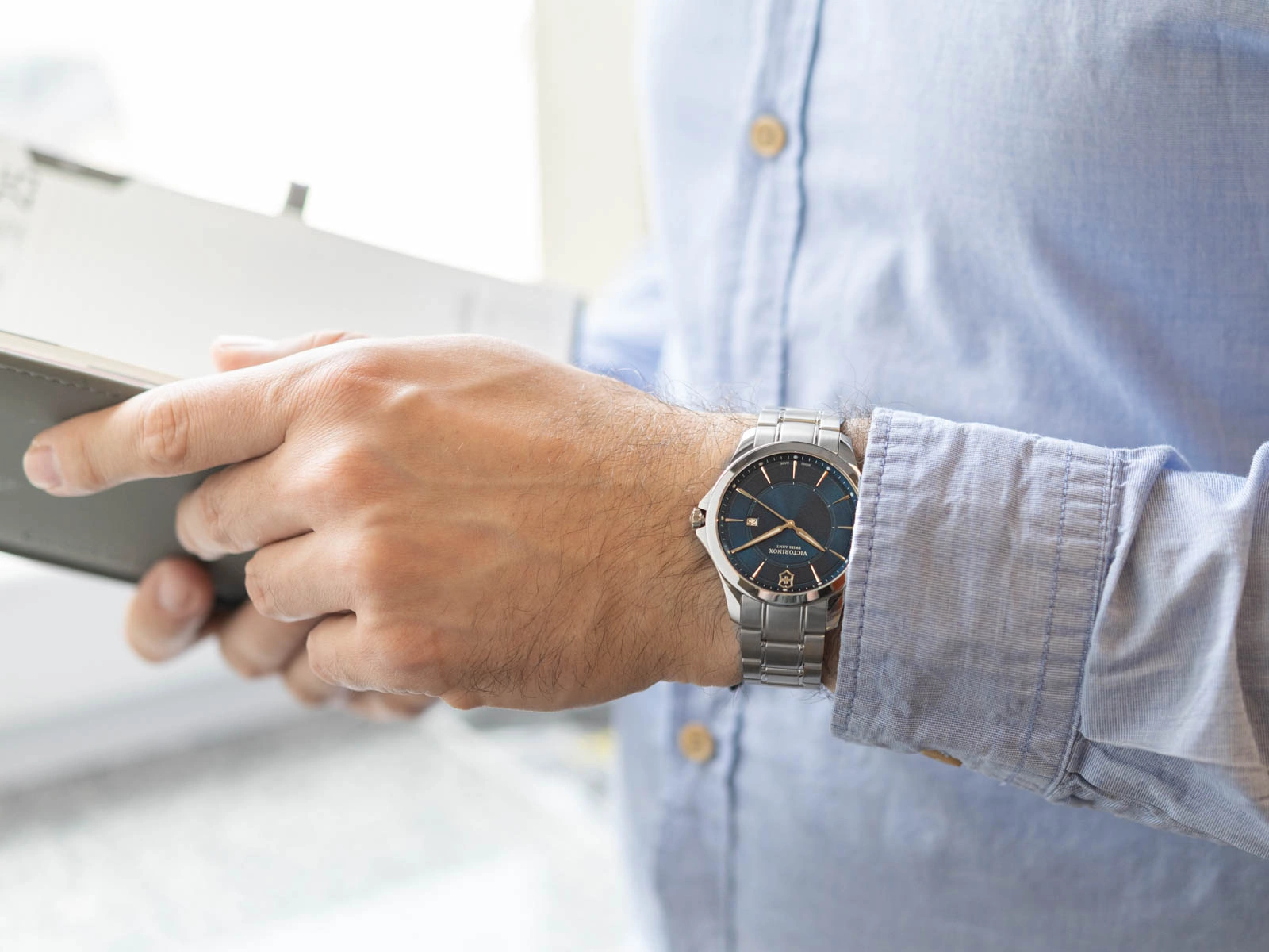 Victorinox 241910.1 Alliance to ucieleśnienie szwajcarskiej filozofii tworzenia przedmiotów niezawodnych, trwałych i ponadczasowych. To zegarek, który nie szuka rozgłosu, a jednak przyciąga spojrzenia. Nie próbuje być ekstrawagancki, a mimo to wyróżnia się klasą. Każdy jego element – od stalowej koperty po granatową tarczę – został opracowany z niemal chirurgiczną precyzją, zgodnie z wartościami marki, która od dekad nie tylko wyznacza standardy w zegarmistrzostwie, ale także przekracza granice użytkowego rzemiosła. W centrum uwagi znajduje się elegancka tarcza, utrzymana w głębokim odcieniu granatu, który w zależności od kąta padania światła mieni się subtelnymi refleksami. Szlif słoneczny nie tylko dodaje jej wyrazistości, ale także dynamizuje kompozycję, nadając jej głębię i charakter. Zastosowanie minimalistycznych indeksów oraz wskazówek typu dauphine wprowadza porządek i harmonię, dzięki którym odczyt godziny staje się intuicyjny i bezbłędny. Delikatnie zintegrowany datownik, umieszczony przy godzinie trzeciej, nie zakłóca kompozycji, lecz ją dopełnia, oferując praktyczne uzupełnienie funkcjonalności zegarka. Wskazówki oraz punktowe indeksy pokryto masą luminescencyjną Super-Lumi-Nova, umożliwiającą po wcześniejszym naświetleniu wygodne korzystanie z czasomierza nawet w ciemnościach.