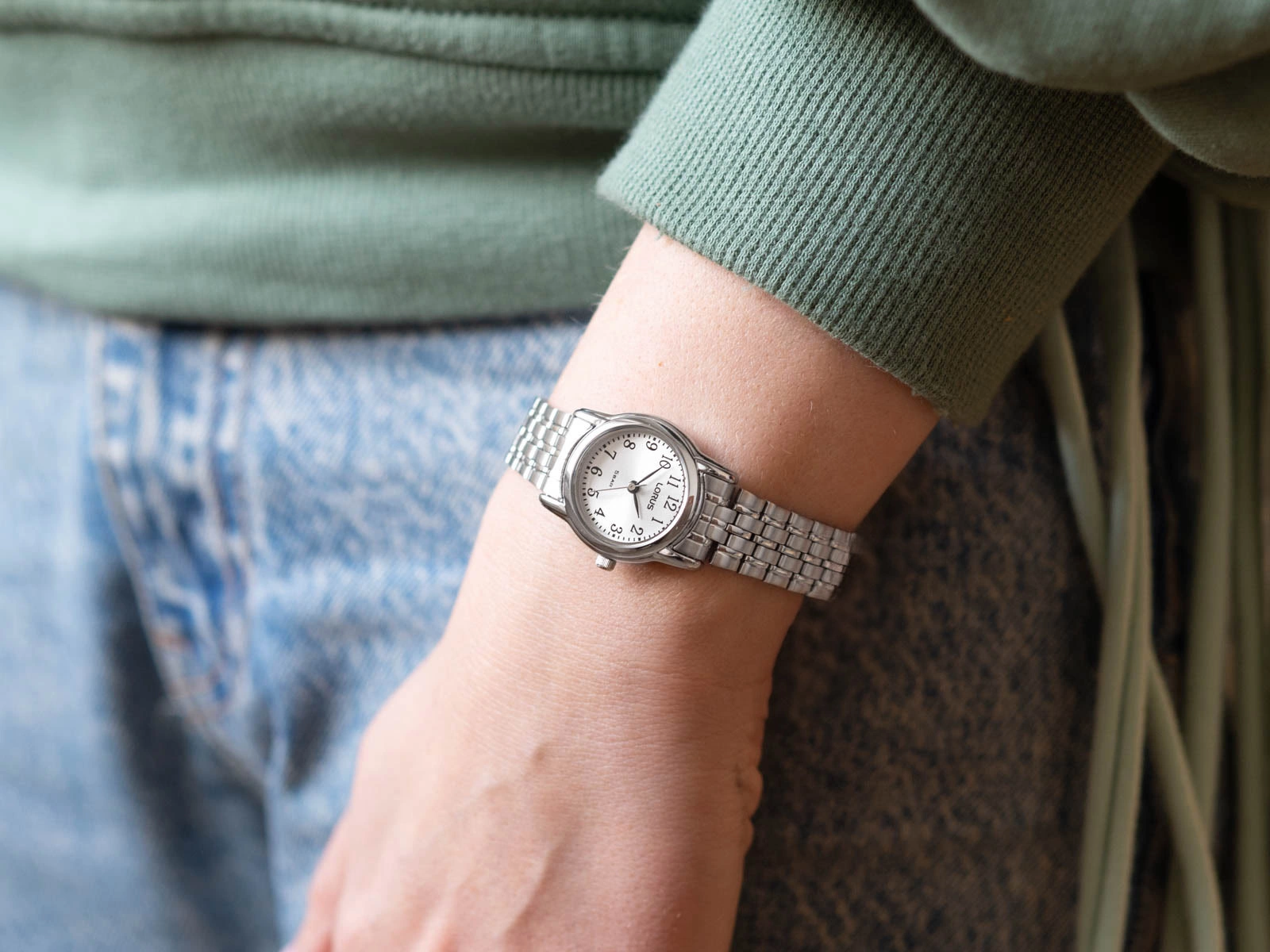 Lorus RRS29HX9 to zegarek, który dzięki swojej uniwersalnej kolorystyce z łatwością dopasuje się do każdej stylizacji – zarówno codziennej, jak i bardziej eleganckiej. Model w całości utrzymany jest w klasycznym, srebrnym odcieniu, co z pewnością przypadnie do gustu miłośniczkom ponadczasowej, metalicznej estetyki. Subtelny połysk koperty i bransolety dodaje całości wyjątkowego uroku, podkreślając minimalistyczny charakter zegarka. Wyposażony w trwałe, mineralne szkło, skutecznie chroni tarczę przed zarysowaniami i drobnymi uszkodzeniami. Czytelny cyferblat, utrzymany w jasnej tonacji, został wyraźnie oznaczony cyframi arabskimi, które kontrastują z tłem, zapewniając doskonałą widoczność godziny w każdych warunkach. Całość tworzy spójny i harmonijny design, który łączy funkcjonalność z estetyką.