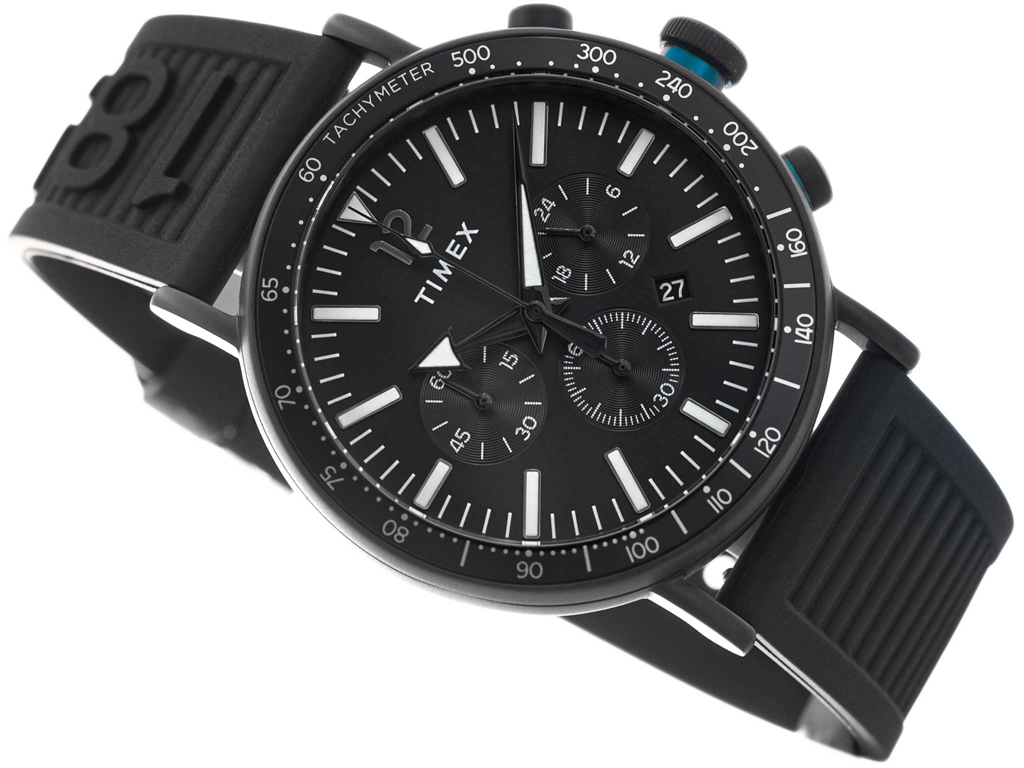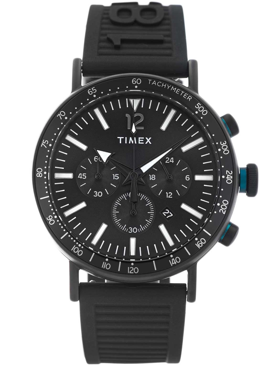 - Wodoszczelny Zegarek Męski Timex TW2V71900 Waterbury Standard Chronograph czarny na pasku, posiada funkcję chronografu, datownika oraz neobrite.