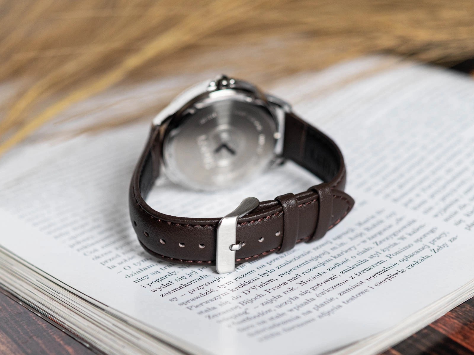 Zegarek został osadzony w solidnej, srebrzystej kopercie o klasycznym kształcie, która harmonijnie współgra z minimalistyczną czarną tarczą. Jasne indeksy godzinowe oraz smukłe, fosforyzujące wskazówki zapewniają znakomitą czytelność – zarówno w świetle dziennym, jak i po zmroku. Po ekspozycji na światło wskazówki sa widoczne w ciemności, umożliwiając wygodne sprawdzenie godziny w trudniejszych warunkach. Praktycznym dodatkiem jest datownik umieszczony przy godzinie 3, który w przejrzysty sposób wskazuje aktualny dzień miesiąca – idealne rozwiązanie dla osób ceniących funkcjonalność w eleganckim wydaniu.