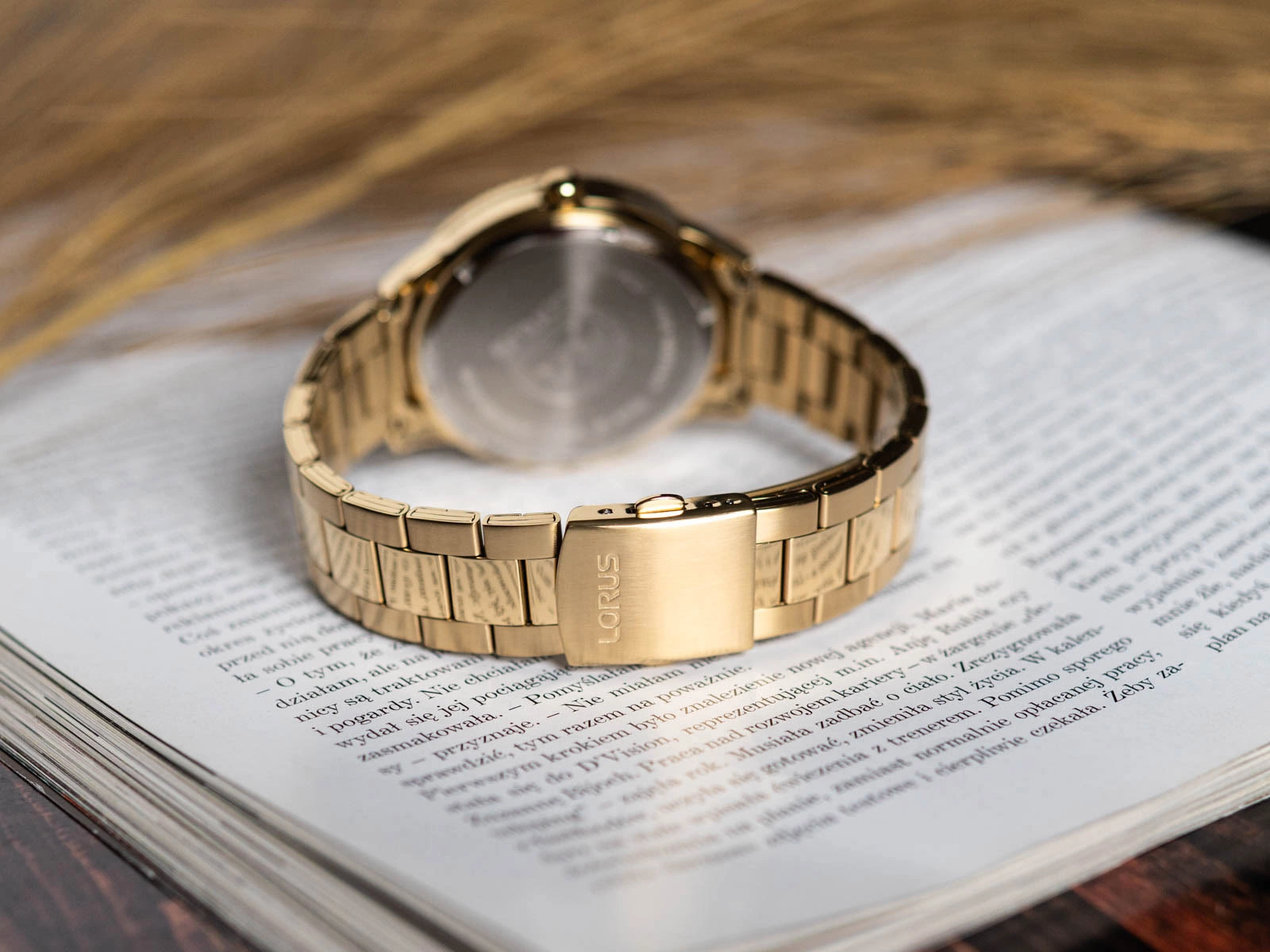• Wodoszczelny Zegarek Męski Lorus RX308AX9 złoty na bransolecie, posiada funkcję datownika.