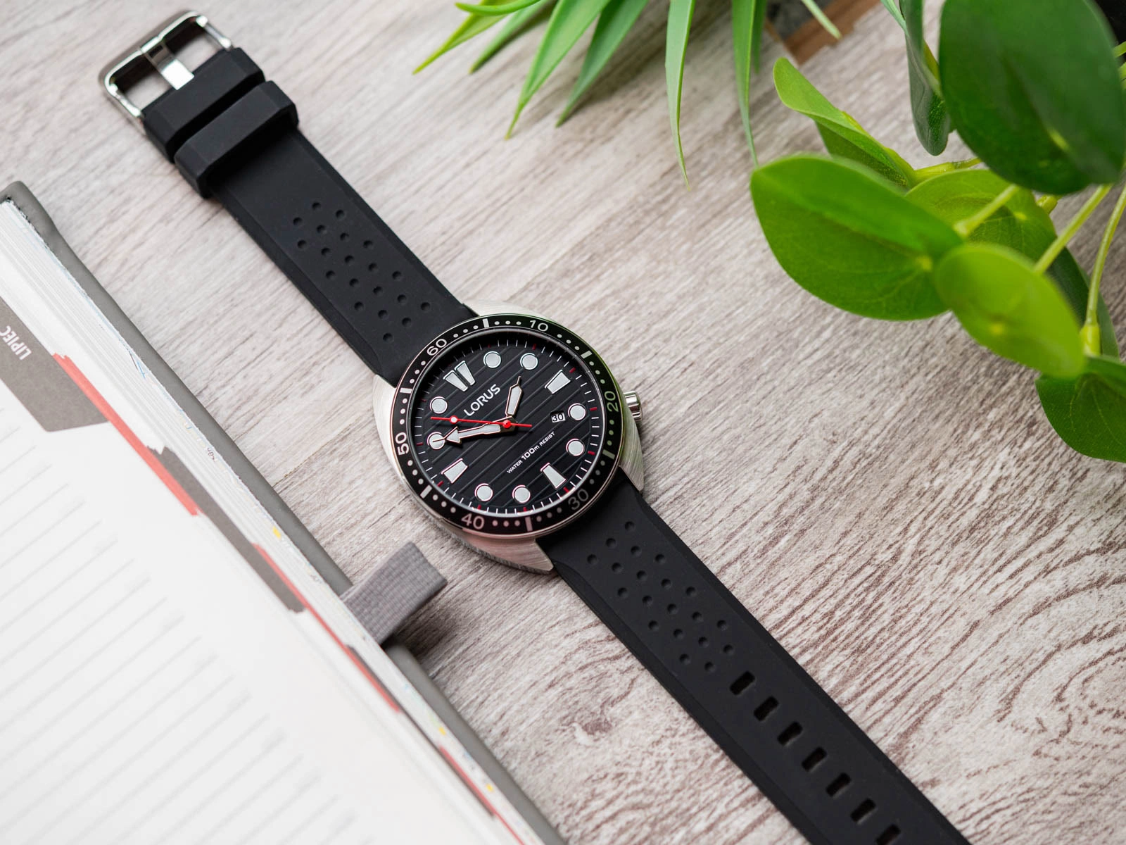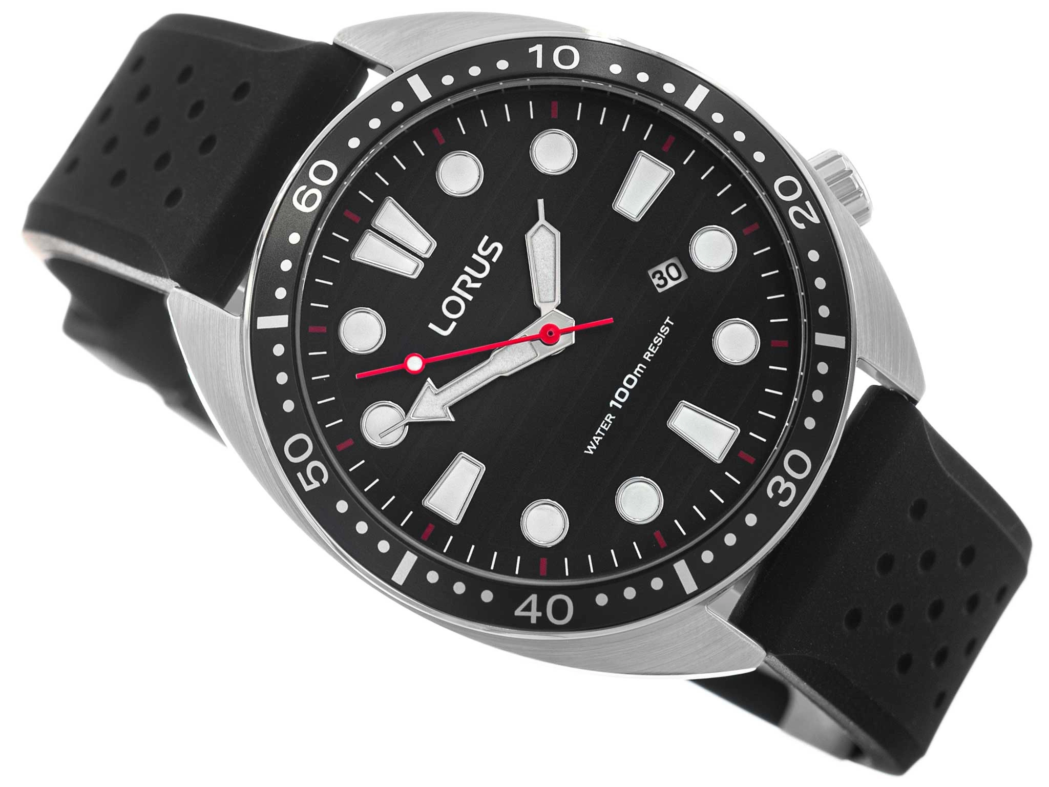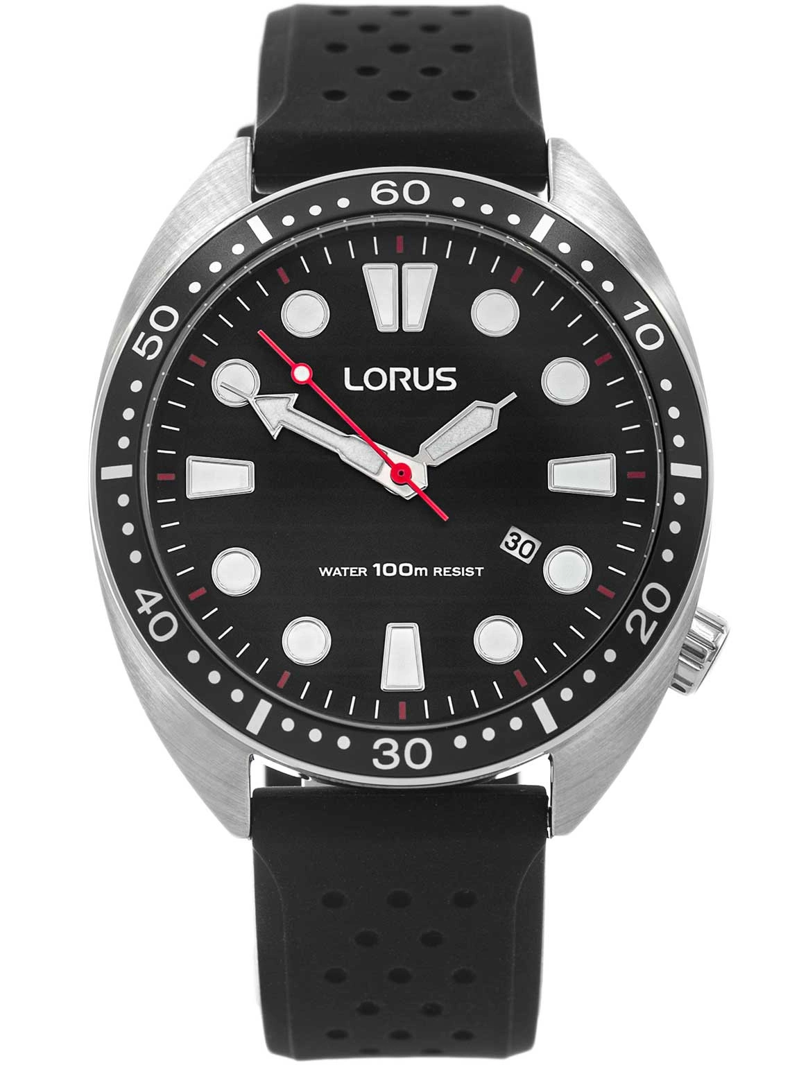- Wodoszczelny Zegarek Męski Lorus RH929LX9 czarny na pasku, posiada funkcję datownika.