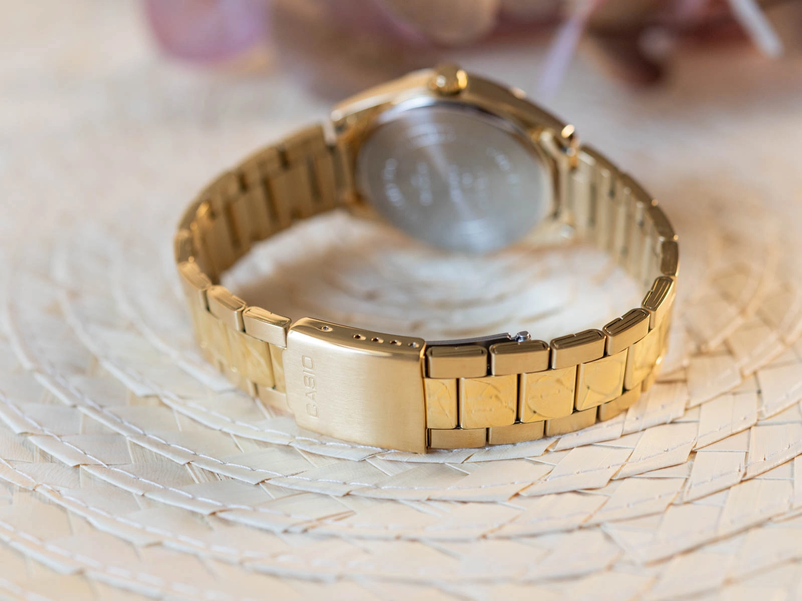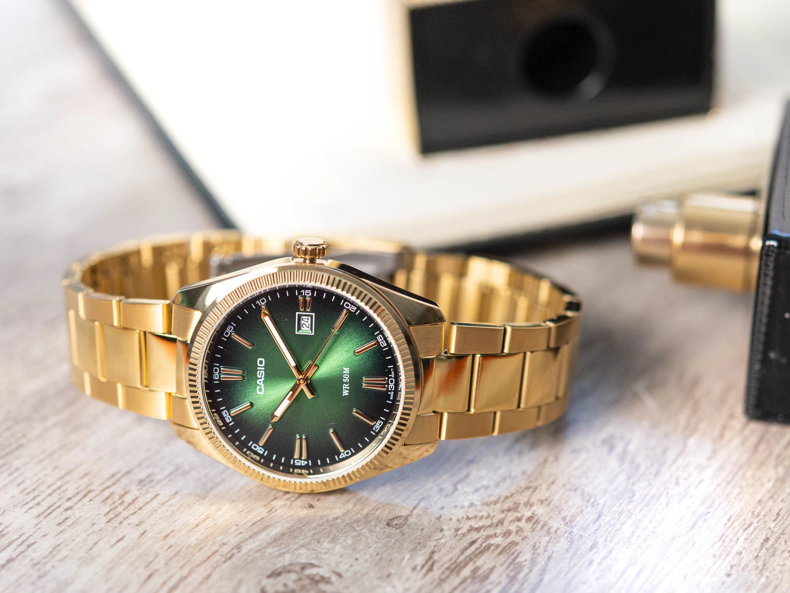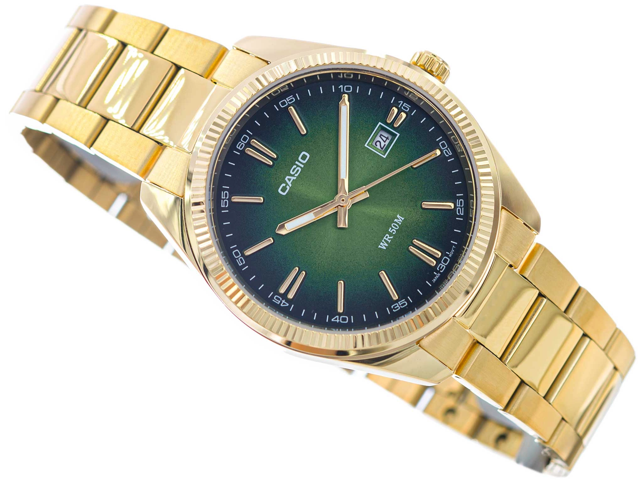 MTP-1302PGC-3AVEF to elegancki zegarek z portfolio Casio, który harmonijnie łączy klasyczną formę z nieoczywistą, stylową kolorystyką. Projekt oparty na sprawdzonej, ponadczasowej stylistyce zyskuje nowy wymiar dzięki intensywnie zielonemu cyferblatowi wykończonemu efektownym szlifem słonecznym. Tarcza, odbijająca światło pod różnymi kątami, tworzy dynamiczny efekt wizualny, podkreślający charakter czasomierza i wyróżniający go na tle tradycyjnych modeli. Koperta modelu MTP-1302PGC-3AVEF została wykonana z odpornej na korozję stali szlachetnej i pokryta powłoką w złotym kolorze, co nadaje konstrukcji szlachetności i elegancji. Kompozycję uzupełnia stalowa bransoleta w tej samej tonacji, zapinana na bezpieczne zapięcie zatrzaskowe. Całość prezentuje się spójnie i wyważenie, zachowując ponadczasowy urok.