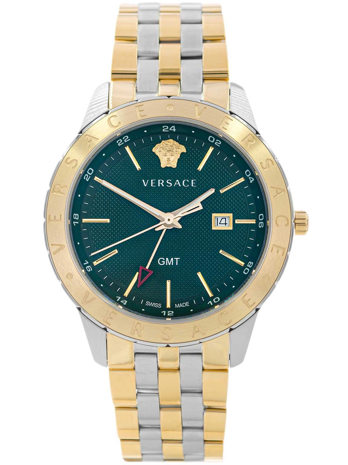 - Zegarek Męski Versace VEBK00718 srebrno-złoty na bransolecie. Posiada funkcje datownika, neobrite oraz GMT