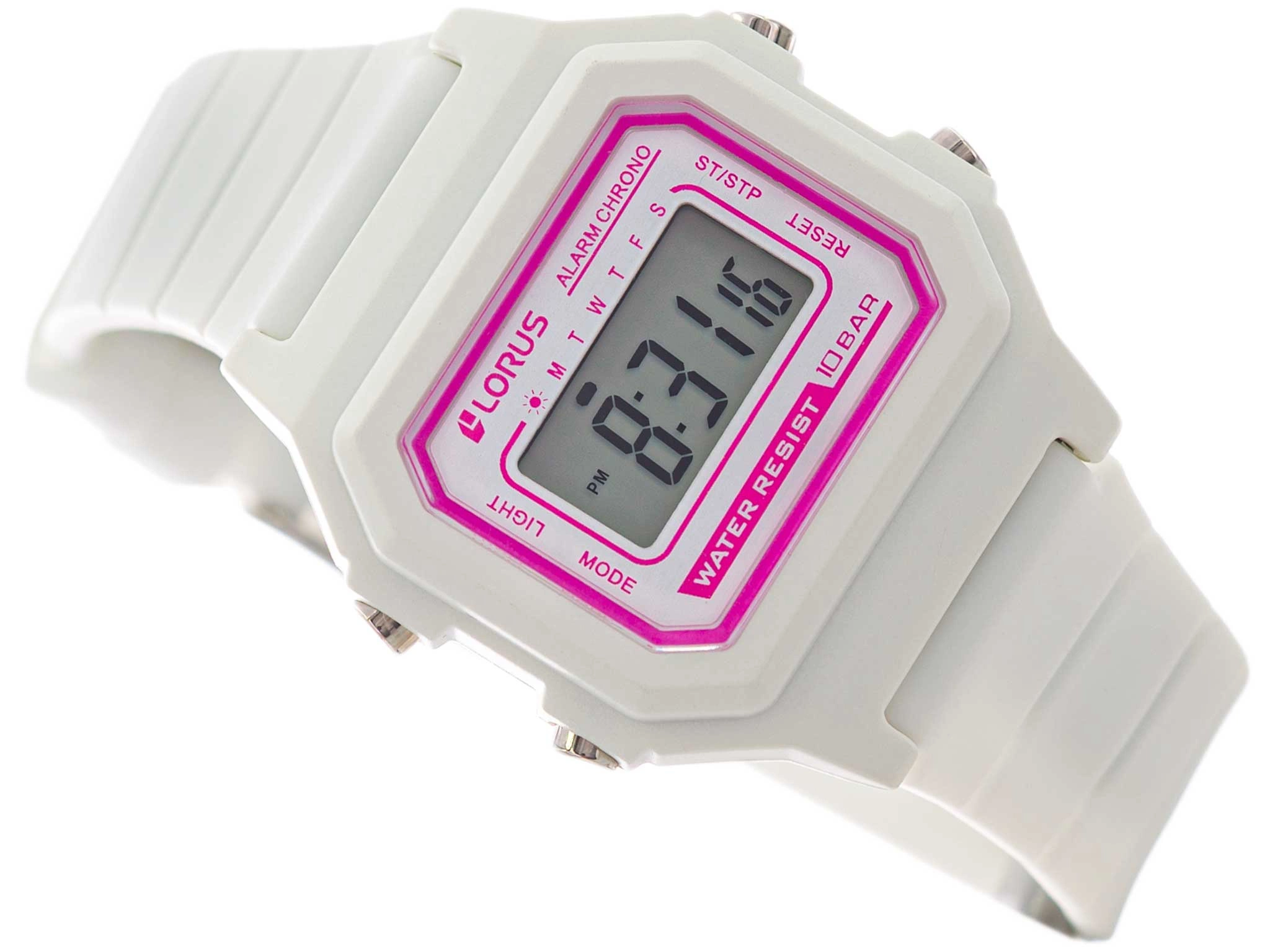 - Zegarek Dziecięcy KIDS Lorus R2321NX9 biały na pasku, posiada funkcje takie jak stoper i datownik.