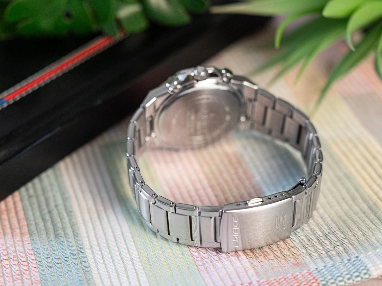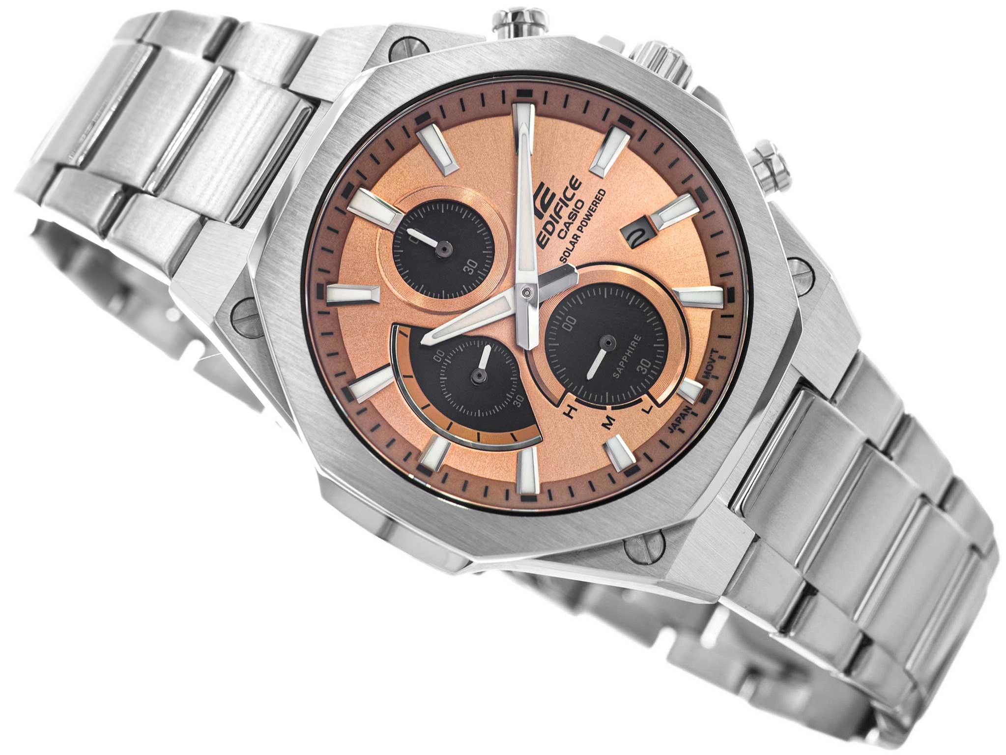 Casio Edifice EFS-S570D-5AUEF to elegancki i nowoczesny zegarek, który łączy zaawansowaną technologię z wyrazistym designem. Wykonany w całości z wysokiej jakości stali szlachetnej, model ten odznacza się odpornością na korozję oraz wyjątkową trwałością, zachowując przy tym stylowy, męski charakter. Charakterystycznym elementem konstrukcji jest płaski, ośmiokątny bezel, który dodaje całości nowoczesnego, industrialnego sznytu. Uwagę przyciąga pomarańczowy cyferblat, który nadaje zegarkowi unikalnego wyrazu. Został on zabezpieczony szafirowym szkłem, znanym z wysokiej odporności na zarysowania, co sprawia, że tarcza na długo zachowuje swoją przejrzystość. W tarczy zintegrowane są panele słoneczne, dzięki którym zegarek zasila się energią ze światła dziennego i sztucznego – to praktyczne i ekologiczne rozwiązanie pozwala cieszyć się niezawodnym działaniem bez konieczności regularnej wymiany baterii.