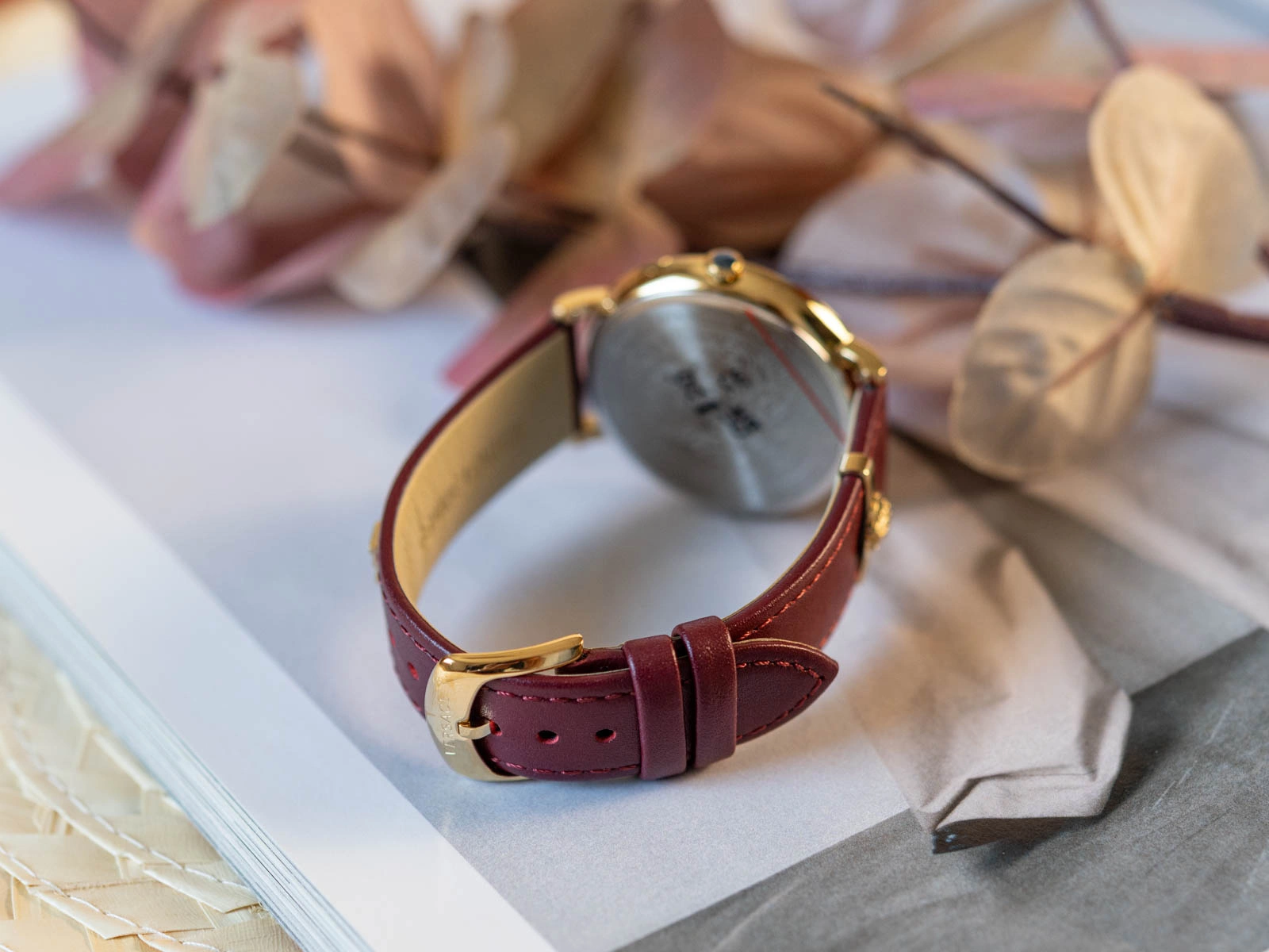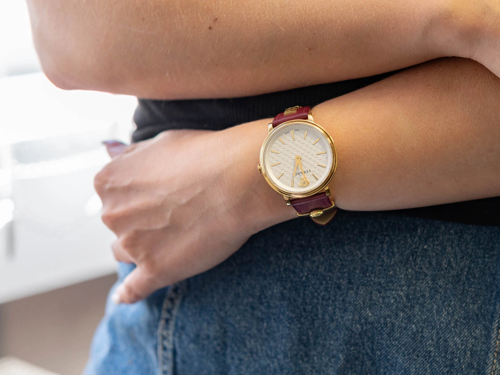 VERSACE V-CIRCLE VE8104322 to zegarek, który przyciąga uwagę już od pierwszego spojrzenia, łącząc klasyczną elegancję z wyrazistym charakterem charakterystycznym dla estetyki marki. Jego złota koperta, o smukłych i gładkich liniach, tworzy harmonijną oprawę dla tarczy utrzymanej w jasnej tonacji. Delikatna faktura na powierzchni cyferblatu subtelnie łamie światło, dodając całości głębi i lekkości, a złote wskazówki i indeksy w formie cienkich, liniowych znaczników dopełniają minimalistycznego układu. Cyferblat zabezpiecza szkło szafirowe. Czerwony pasek wykonany z wysokiej jakości skóry naturalnej zyskuje zupełnie nowy wymiar dzięki złotemu logotypowi VERSACE. Ten detal nie tylko stanowi mocny akcent wizualny, ale też podkreśla wyraźną tożsamość marki i świadome nawiązanie do modowego dziedzictwa domu mody Versace. Zapięcie paska zostało zaprojektowane z myślą o komforcie i pewnym dopasowaniu do nadgarstka. Zegarek VERSACE V-CIRCLE VE8104322 napędzany jest precyzyjnym szwajcarskim mechanizmem kwarcowym, który zapewnia dokładność chodu i niezawodność w codziennym użytkowaniu. Konstrukcja zegarka, przy całej swojej estetycznej lekkości, zachowuje wysoką funkcjonalność i sprawdza się zarówno w bardziej formalnym, jak i codziennym stylu. Model VERSACE V-CIRCLE VE8104322 to nowoczesna interpretacja kobiecego zegarka, która łączy w sobie klasykę bieli i złota z dynamicznym akcentem kolorystycznym. Elegancko zapakowany w firmowe pudełko, stanowi gotową propozycję na wyjątkowy prezent – stylowy, charakterystyczny i zawsze na czasie.