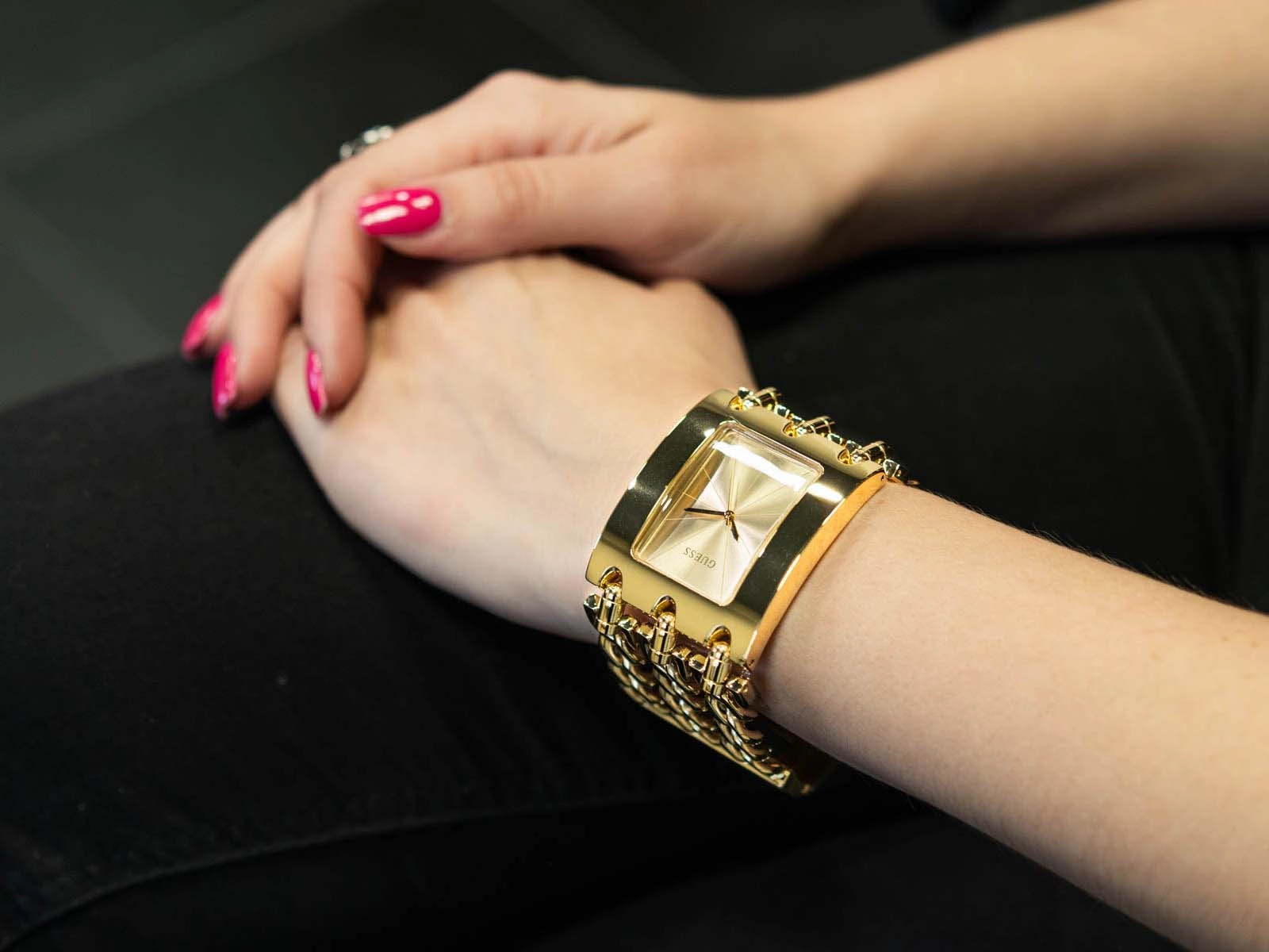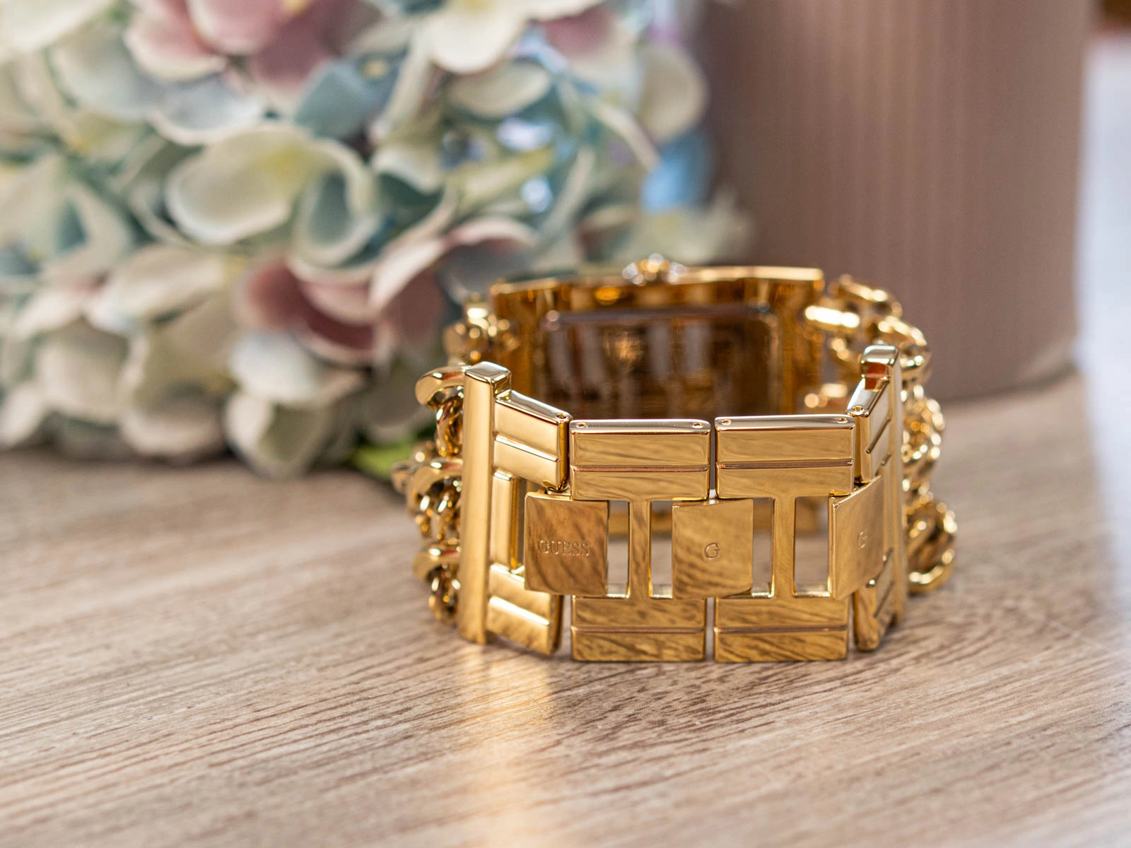 GUESS Heavy Metal W1274L2 to zegarek damski, który łączy nowoczesne trendy z odważną, biżuteryjną formą. Stworzony z myślą o kobietach, które pragną wyróżniać się nie tylko stylem, ale również pewnością siebie. Ten model to idealne połączenie elegancji i funkcjonalności – doskonały zarówno do codziennych stylizacji, jak i na wyjątkowe okazje. Całość utrzymana została w jednolitej, złotej tonacji, która dodaje zegarkowi klasy i luksusowego wyrazu. Na uwagę zasługuje szeroka bransoleta w formie potrójnego łańcucha – wyrazista, kobieca i przyciągająca wzrok. Prostokątna tarcza o wyrazistych rozmiarach stanowi mocny punkt kompozycji, a jej geometryczny kształt pięknie układa się na nadgarstku, nadając stylizacji nowoczesnego charakteru. Bransoleta została wykonana z wysokiej jakości stali szlachetnej – materiału odpornego na korozję i codzienne użytkowanie. Dzięki systemowi G-LINK, dopasowanie długości możliwe jest bez wizyty u zegarmistrza – co doceni każda nowoczesna kobieta. Pod mineralnym szkiełkiem znajduje się tarcza z logo marki, która dopełnia całości swoim minimalistycznym wykończeniem.