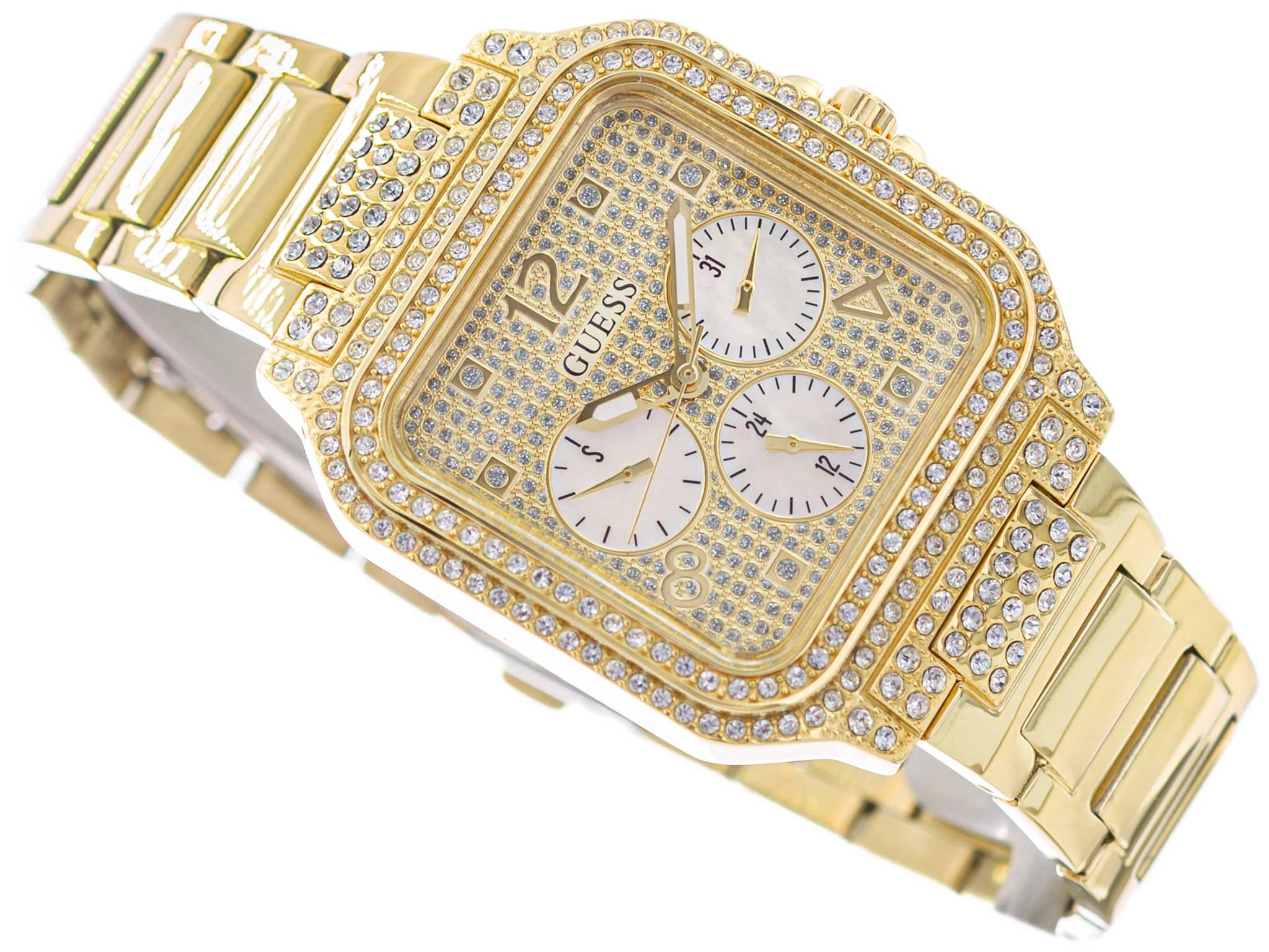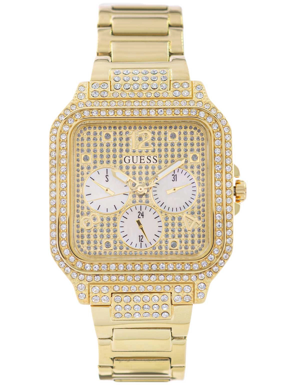 Guess GW0472L2 Deco to elegancki manifest kobiecego stylu — harmonijne połączenie nowoczesnej formy z biżuteryjnym wykończeniem. Ten wyjątkowy zegarek przyciąga uwagę wyrafinowanym blaskiem cyrkonii, które subtelnie ozdabiają kopertę, dodając całości prestiżowego charakteru i wyrazistej elegancji. Kwadratowa tarcza zachwyca dopracowanymi detalami — umieszczono na niej trzy funkcjonalne subtarcze w perłowym odcieniu, które prezentują czas w formacie 24-godzinnym, dzień tygodnia oraz datę. Takie rozwiązanie łączy styl z praktycznością, oferując szybki dostęp do kluczowych informacji w codziennym życiu. Tarcza osłonięta jest odpornym na zarysowania szkłem mineralnym, które dba o estetykę i czytelność nawet przy intensywnym użytkowaniu.