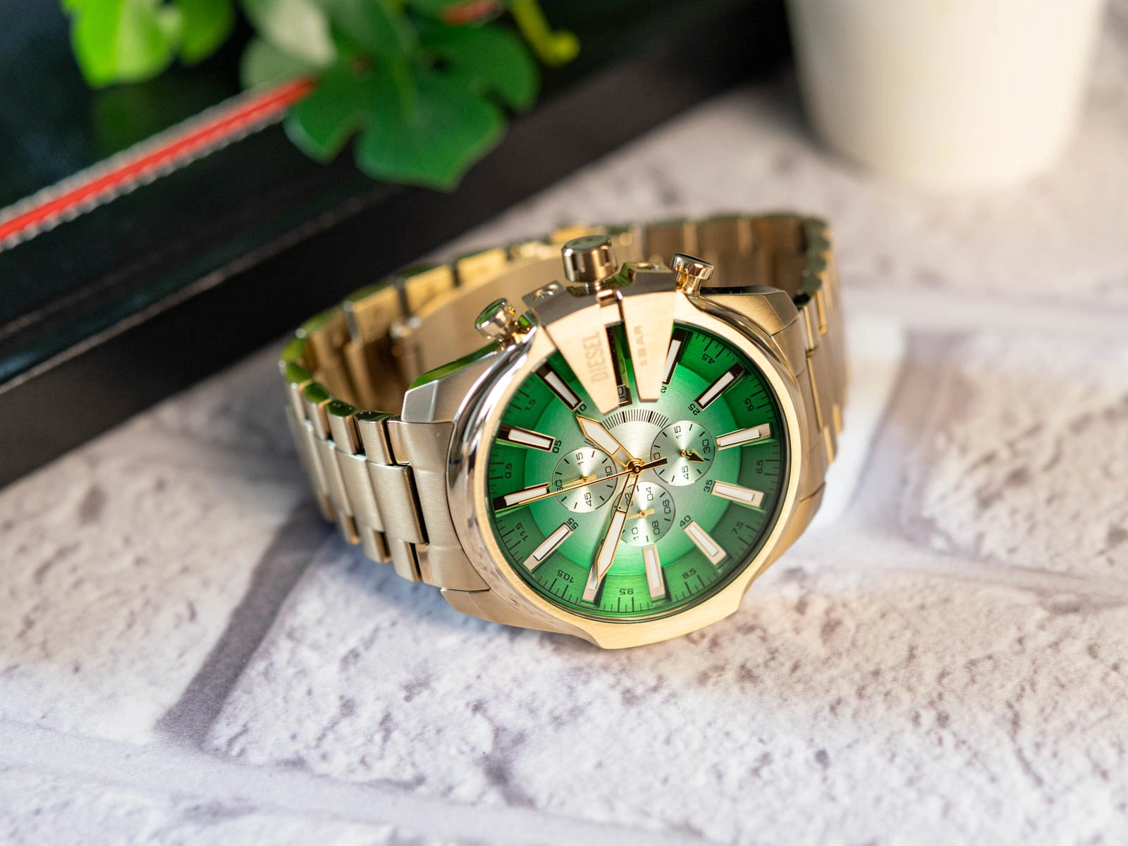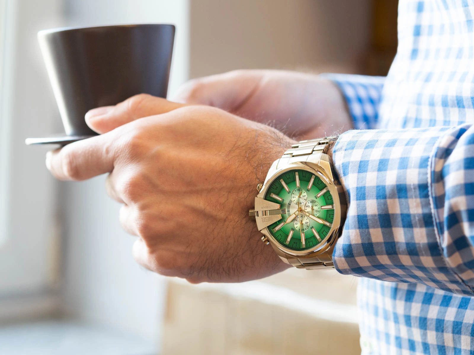 Na szczególną uwagę zasługuje zielona tarcza, która stanowi ciekawe przełamanie klasycznej kolorystyki. Umieszczono na niej analogowy stoper, który obsługiwany jest za pomocą bocznych przycisków, a także datownik wskazujący aktualny dzień miesiąca – jego lokalizacja przy godzinie 3 sprawia, że jest łatwo zauważalny i czytelny. Wskazówki oraz indeksy pokryto specjalną powłoką neobrite, która po naświetleniu emituje subtelne światło, umożliwiając sprawne odczytanie godziny nawet w ciemności lub przy słabym oświetleniu. To rozwiązanie z pewnością docenią osoby prowadzące aktywny tryb życia lub często podróżujące. Diesel Mega Chief Slim to nie tylko praktyczny zegarek, ale również efektowny dodatek do męskiej garderoby. Jego wyrazisty design podkreśli indywidualny styl właściciela i świetnie dopełni zarówno miejskie, jak i bardziej eleganckie stylizacje. Całość zapakowana jest w eleganckie, firmowe pudełko, co czyni ten model idealnym pomysłem na prezent dla każdego mężczyzny z klasą.