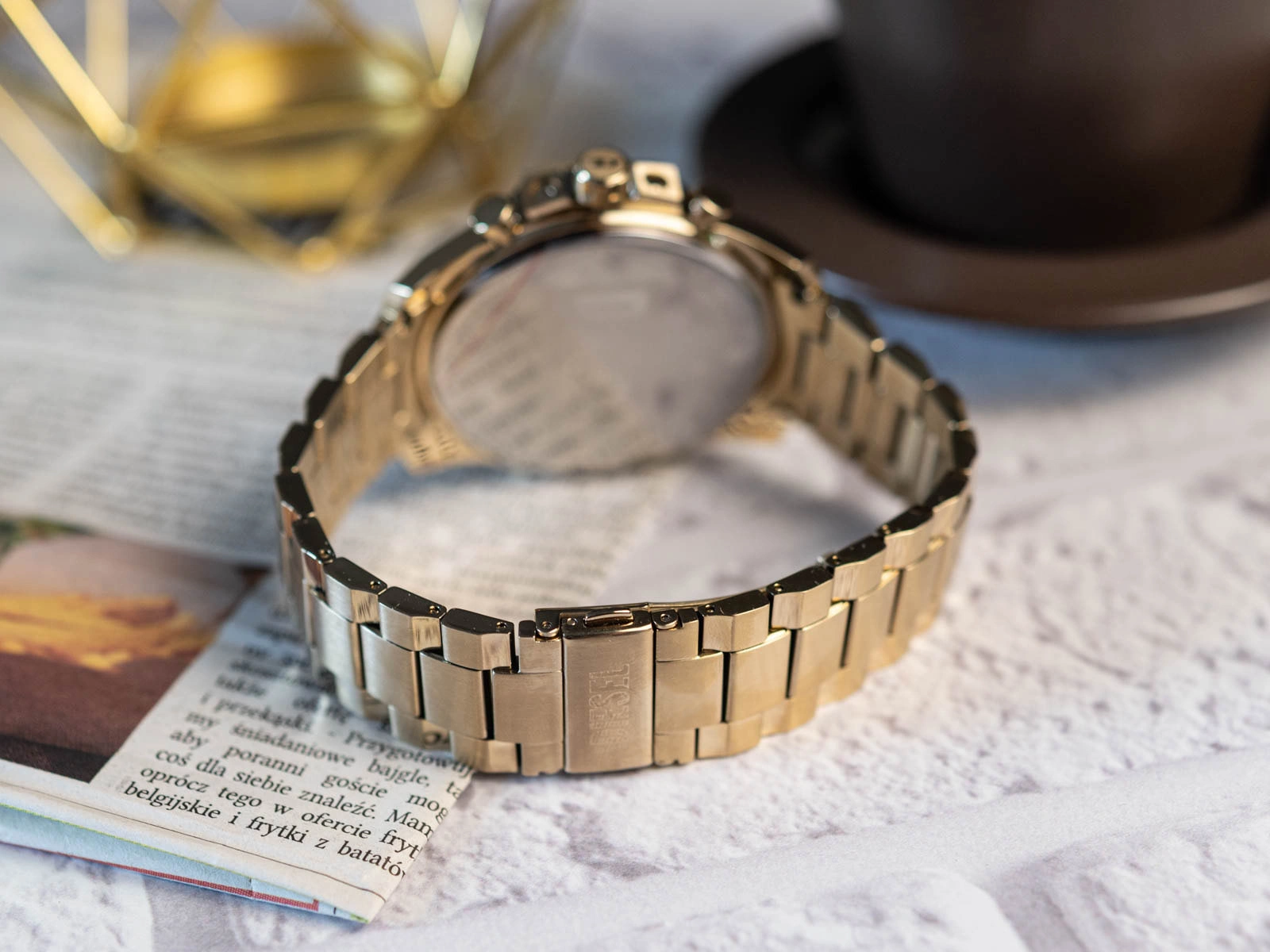 Diesel DZ4684 Mega Chief Slim to wyjątkowy model zaprojektowany z myślą o nowoczesnych mężczyznach, którzy cenią sobie zarówno funkcjonalność, jak i niebanalny styl. Ten imponujący czasomierz wyróżnia się eleganckim wykończeniem w odcieniu złota, co nadaje mu luksusowego charakteru i czyni go znakomitym wyborem na każdą okazję – od codziennych spotkań po bardziej formalne wydarzenia. Zegarek został wyposażony w solidną, szeroką bransoletę wykonaną ze stali szlachetnej, która nie tylko prezentuje się efektownie, ale także zapewnia trwałość i komfort użytkowania. Zapięcie motylkowe umożliwia szybkie zakładanie oraz zdejmowanie zegarka, gwarantując jednocześnie stabilność na nadgarstku.
