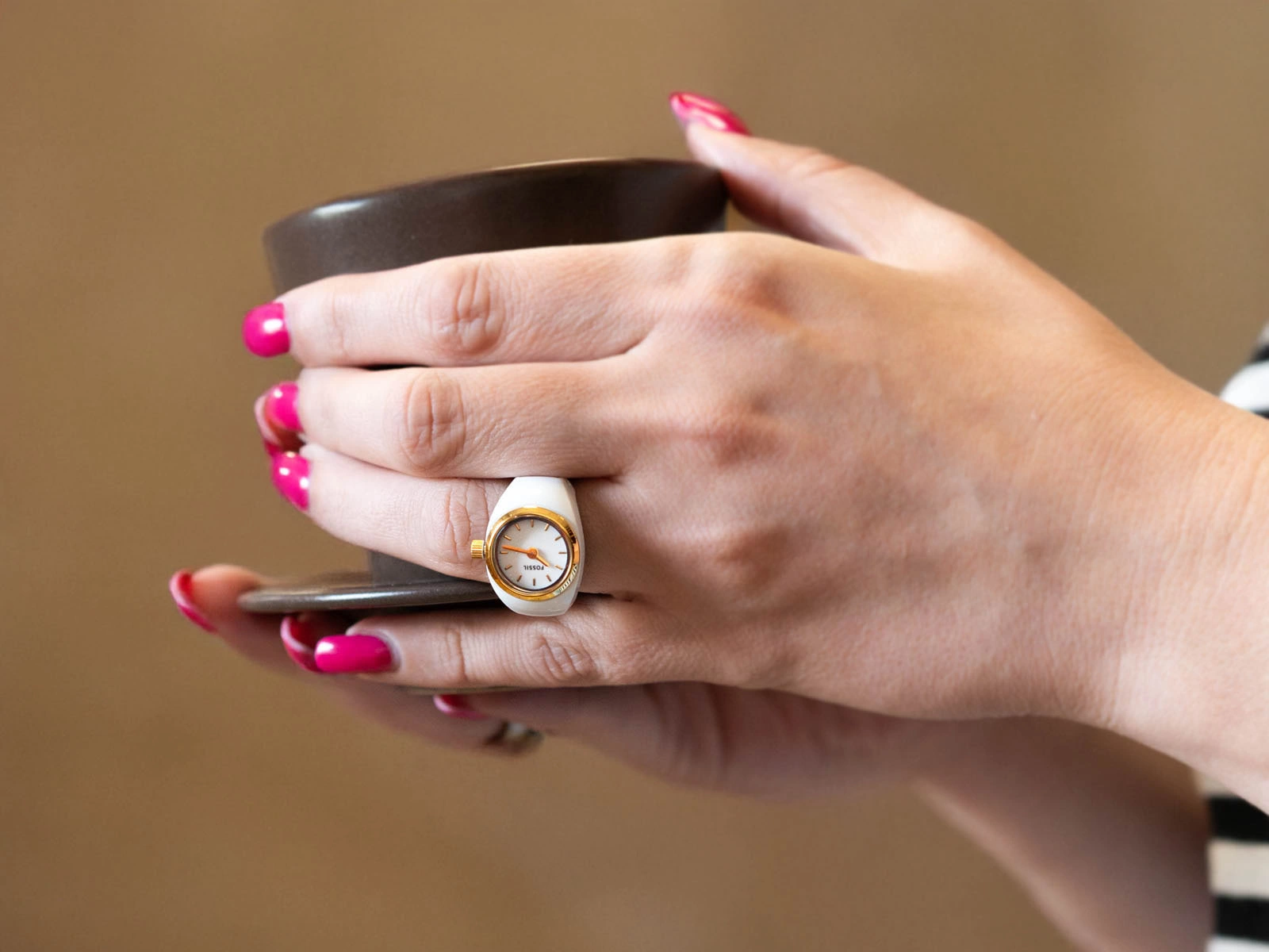 Fossil ES5412 Watch Ring to nowatorska interpretacja zegarka, w której klasyczna funkcja odmierzania czasu przenika się z formą biżuterii. Wykonany ze stali szlachetnej w tonacji bieli i złota, model ten przyciąga uwagę subtelnym kontrastem barw oraz minimalistycznym eleganckim designem, które podkreślają jego ozdobny charakter. Centralnie osadzona biała tarcza pozostaje dyskretna, ale czytelna, zachowując równowagę między formą a funkcjonalnością. Elastyczna obręcz dopasowuje się do palca, zapewniając wygodę noszenia i lekkość typową dla biżuterii. Całość dopełnia precyzyjny mechanizm kwarcowy, ukryty w konstrukcji, która z powodzeniem zastępuje tradycyjny zegarek, stając się jednocześnie wyrazistym elementem stylu. Fossil ES5412 to elegancja w nowej, odważnej odsłonie, gdzie zegarek staje się integralną częścią kobiecej biżuterii. Pierścionek pakowany jest w logowane eleganckie pudełeczko, które doskonale sprawdzi się jako opakowanie na prezent.
