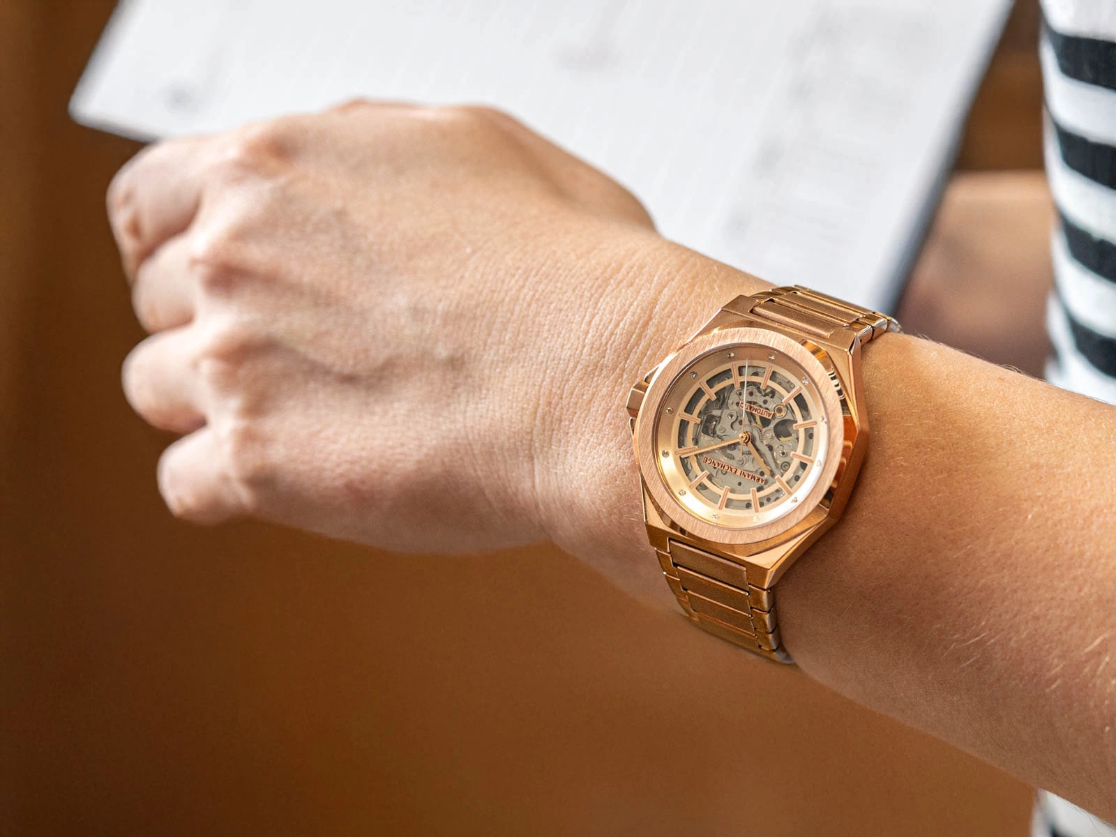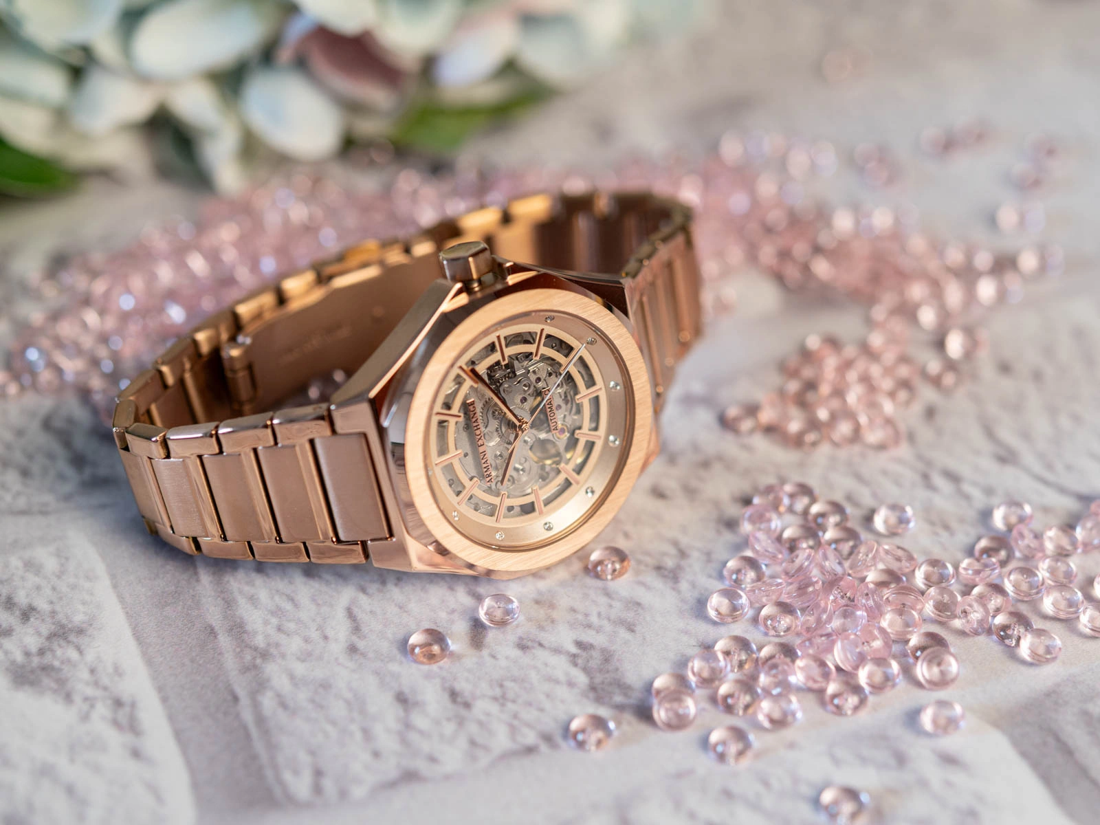 Zegarek Armani Exchange Andrea AX4619 to wyrafinowana propozycja włoskiego domu mody, która zachwyca nie tylko piękną formą, ale i funkcjonalnością. Model utrzymany w tonacji różowego złota emanuje ciepłem i kobiecą elegancją, doskonale wpisując się w aktualne trendy biżuteryjnego minimalizmu z nutą luksusu. Napędzany automatycznym mechanizmem, model ten wykorzystuje energię ruchu właściciela, eliminując potrzebę stosowania baterii. Centralnym punktem czasomierza jest otwarta tarcza typu open-heart, która odsłania fragment automatycznego mechanizmu – rozwiązanie to nie tylko nadaje zegarkowi wyjątkowego charakteru, ale również pozwala z bliska obserwować fascynujący rytm jego pracy. Tego rodzaju detal czyni AX4619 nie tylko dodatkiem modowym, lecz także subtelnym hołdem dla sztuki zegarmistrzostwa.