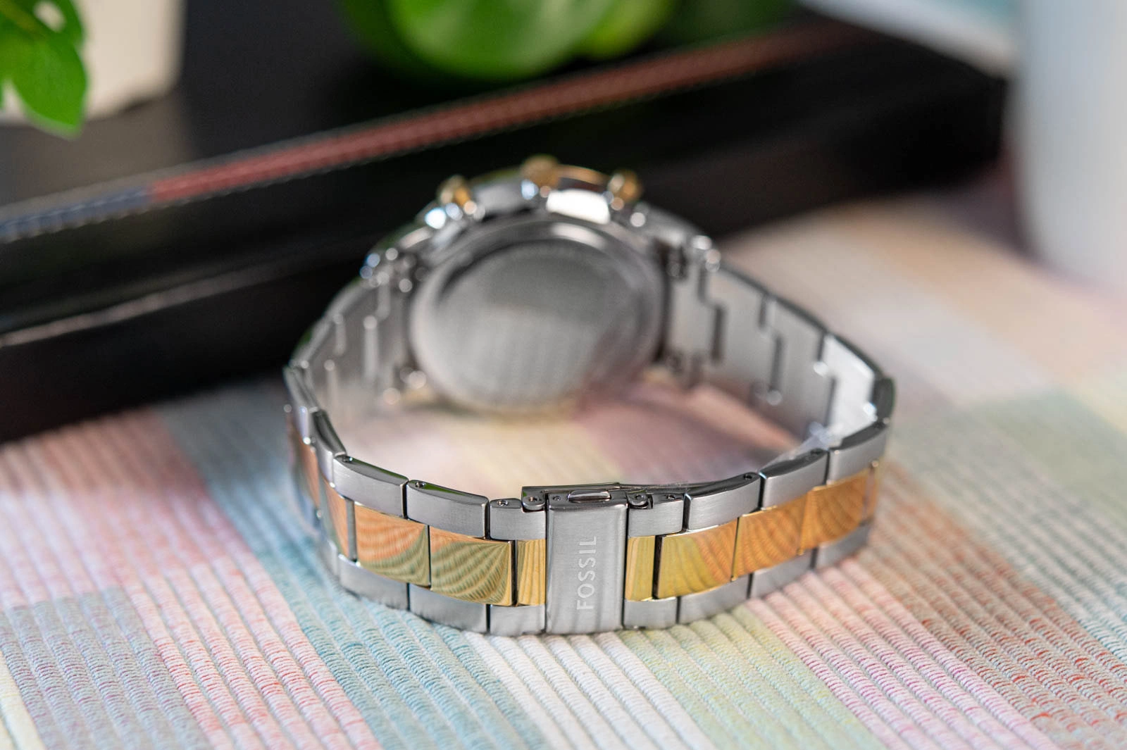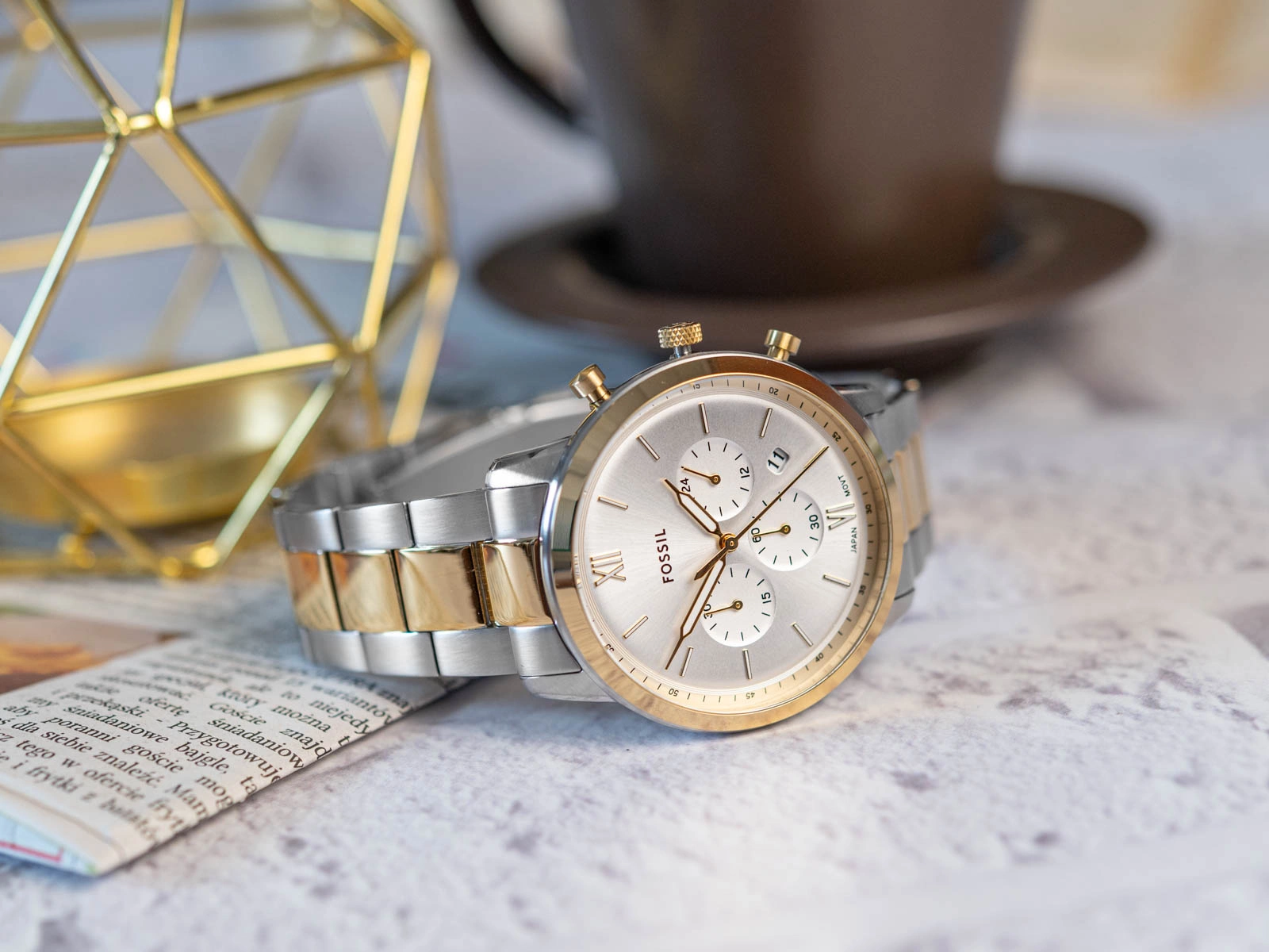 - Zegarek Męski Fossil Neutra Chronograph FS6112 srebrno-złoty na bransolecie, posiada funkcje takie jak stoper, datownik i neobrite.