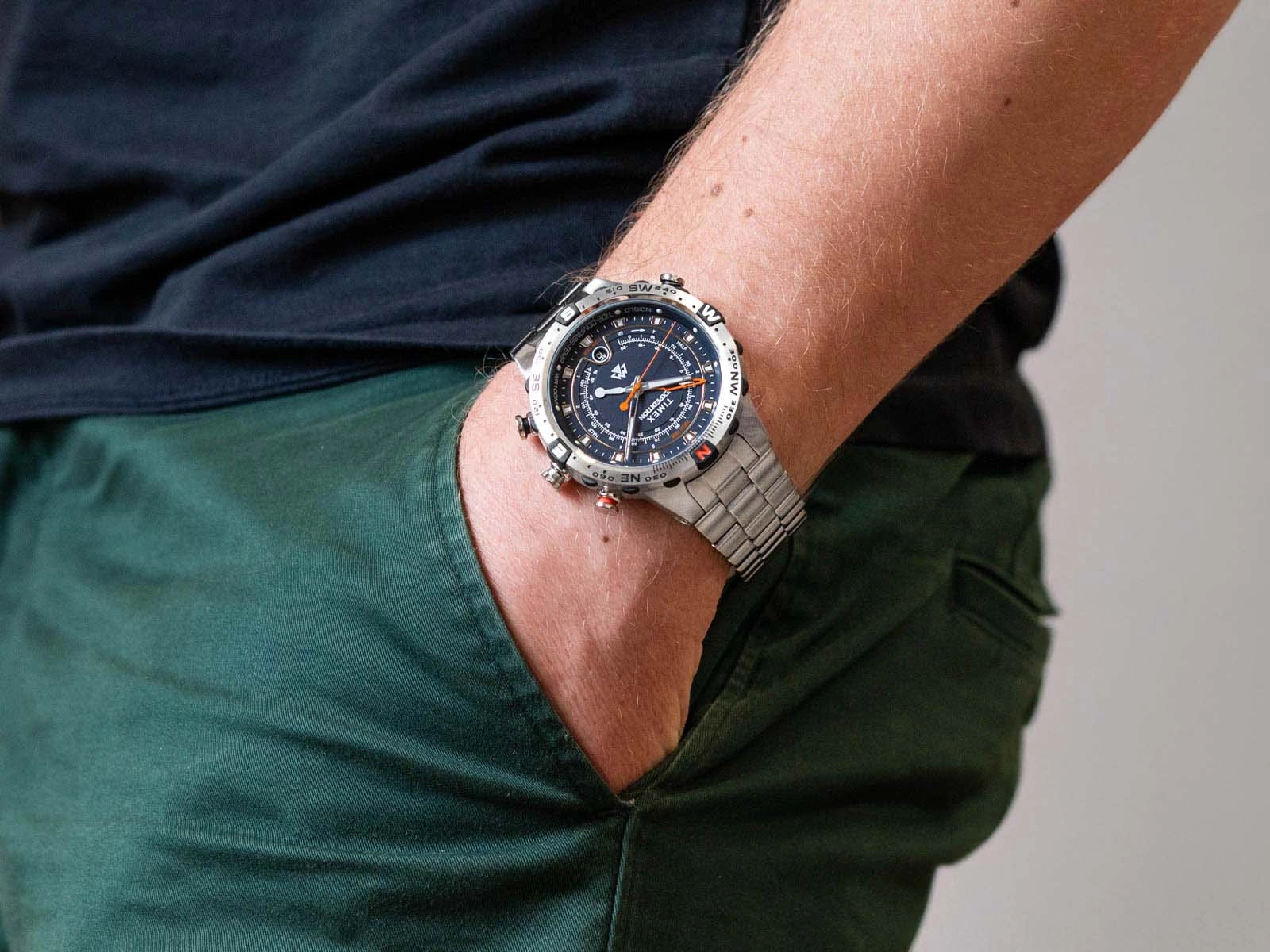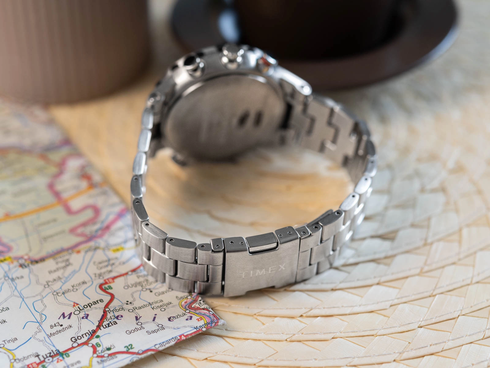 Timex TW2Y12900 Expedition Tide-Temp-Compass to model, który łączy w sobie precyzyjne funkcje użytkowe z eleganckim wykończeniem charakterystycznym dla klasycznych zegarków naręcznych. Solidna koperta wykonana ze stali szlachetnej zestawiona została z pełnowymiarową bransoletą w srebrnym kolorze, która podkreśla bardziej uniwersalny charakter konstrukcji. Również wykonana ze stali i wyposażona w praktyczne zapięcie motylkowe, bransoleta zapewnia trwałość, wygodę noszenia oraz dyskretną elegancję, która nie traci na funkcjonalności nawet podczas intensywnego użytkowania w terenie. Granatowa tarcza wprowadza głęboki, chłodny ton, który nadaje zegarkowi wyrazu i kontrastu wobec srebrzystej konstrukcji. Jej półmatowa powierzchnia została zaprojektowana z myślą o redukcji refleksów świetlnych i zachowaniu maksymalnej czytelności w zróżnicowanych warunkach oświetleniowych. Centralne wskazania czasu zostały uzupełnione o wskaźniki dodatkowych funkcji – kompasu, termometru oraz wskaźnika pływów – które zostały wkomponowane w układ cyferblatu w sposób estetyczny i funkcjonalny zarazem. Wszystkie informacje prezentowane są w czytelnej, analogowej formie, co podkreśla klasyczny charakter zegarka mimo jego zaawansowanych możliwości.