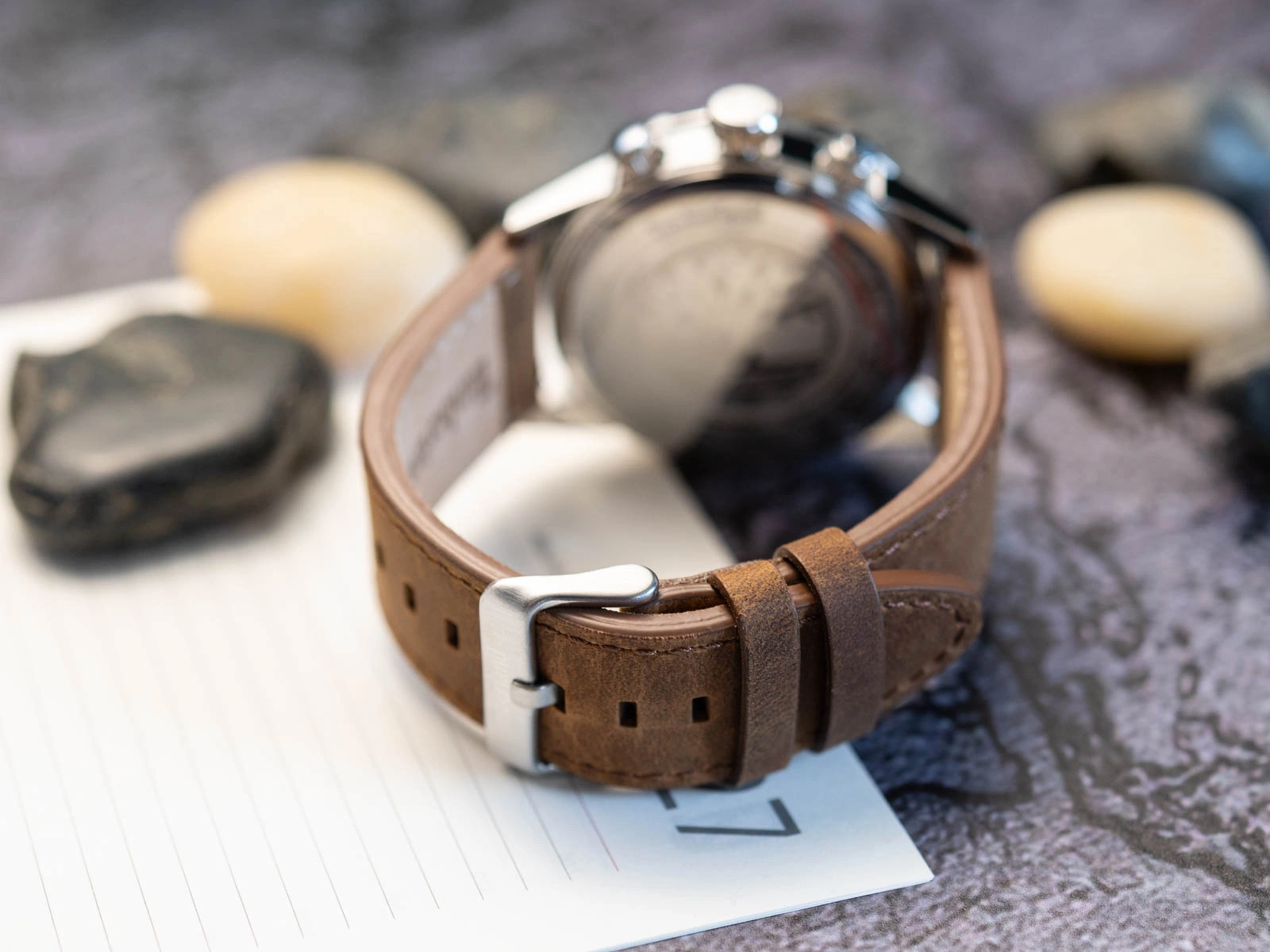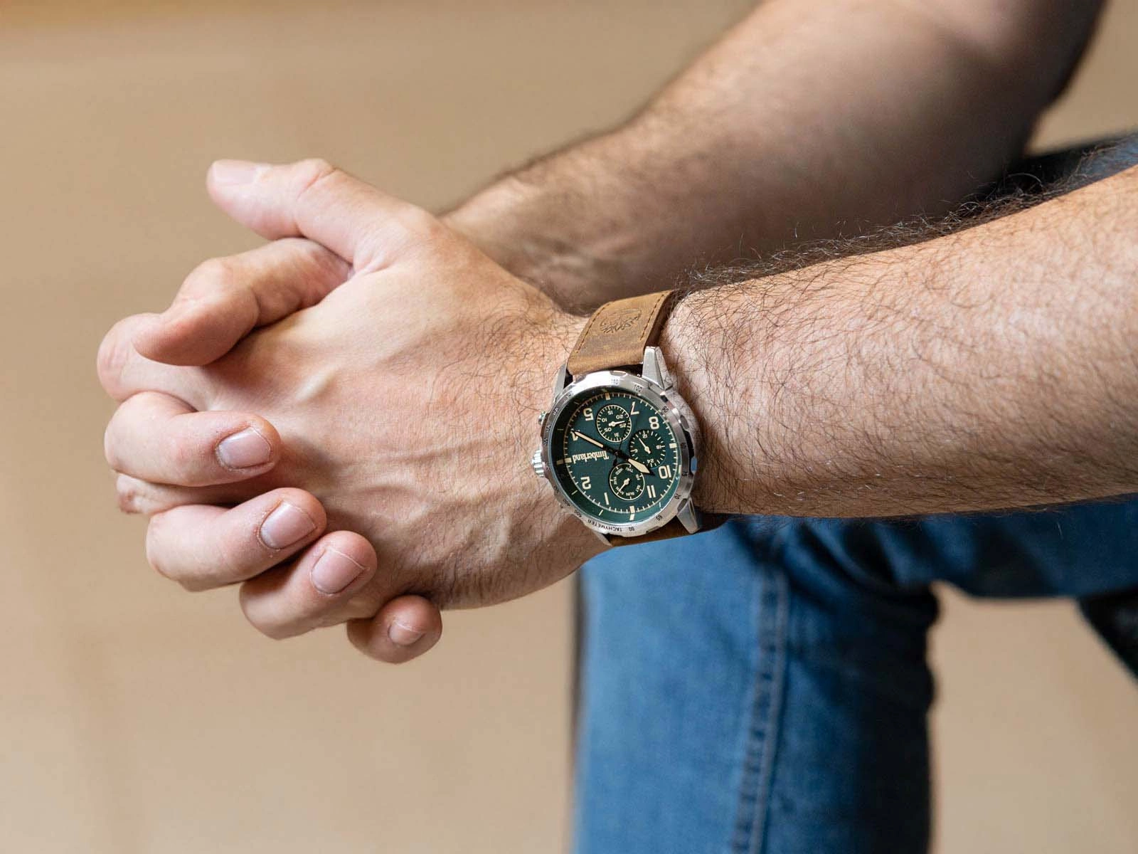 Timberland TDWGF0055402 Campton to zegarek stworzony z myślą o mężczyznach, którzy szukają wyrazistego dodatku łączącego funkcjonalność z niebanalnym wzornictwem. Wykonana z wysokiej jakości stali szlachetnej koperta o solidnym charakterze otacza zieloną tarczę, której intensywna barwa nawiązuje do kolorystyki terenowej i koresponduje z outdoorową tożsamością marki Timberland. W centrum kompozycji znajduje się przejrzysty układ beżowych indeksów, które wyróżniają się na tle głębokiej zieleni, tworząc harmonijne, a jednocześnie praktyczne zestawienie. Tarcza została wyposażona w trzy dyskretne subtarcze datownika, które wskazują czas w trybie 24-godzinnym, dzień miesiąca oraz aktualny dzień tygodnia. Ich staranne rozmieszczenie i spójność kolorystyczna podkreślają funkcjonalny, uporządkowany charakter zegarka. Wyjątkową cechą modelu Timberland TDWGF0055402 Campton jest bezel z naniesioną skalą tachymetru. Ten klasyczny element, zaczerpnięty z zegarków sportowych, służy do obliczania prędkości na podstawie czasu pokonywania określonego dystansu i stanowi ukłon w stronę tradycyjnych rozwiązań o technicznym charakterze. Nadaje całemu projektowi dynamicznego, a jednocześnie świadomie zaprojektowanego wyglądu. Zastosowany w zegarku mechanizm kwarcowy gwarantuje precyzję działania oraz łatwość obsługi, będąc jednocześnie niezawodnym rozwiązaniem dla użytkowników ceniących wygodę. Mineralne szkło chroniące tarczę zapewnia odporność na codzienne zarysowania, a solidna stalowa konstrukcja koperty zabezpiecza wnętrze zegarka przed wpływem zmiennych warunków zewnętrznych. Brązowy pasek z miękkiej, naturalnej skóry idealnie dopełnia kolorystykę modelu, zapewniając wygodę noszenia i trwałość. Tradycyjne zapięcie na sprzączkę pozwala na szybkie i pewne dopasowanie do nadgarstka, a naturalny materiał z czasem nabiera indywidualnego charakteru. Timberland TDWGF0055402 Campton to model, który dzięki starannemu wykonaniu i wyważonemu połączeniu kolorów, detali oraz funkcji, doskonale sprawdzi się zarówno w dynamicznej codzienności, jak i w bardziej swobodnych, weekendowych stylizacjach. Dostarczany w oryginalnym opakowaniu producenta, stanowi świadomy wybór dla mężczyzn szukających zegarka z wyrazistym stylem i praktycznym charakterem.
