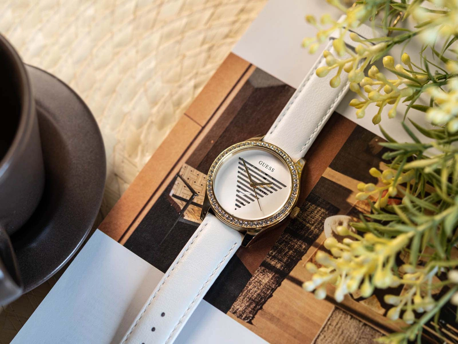 Na szczególną uwagę zasługuje unikalna tarcza zegarka, którą zdobi ją przezroczyste logo w formie charakterystycznego trójkąta, przez które można zajrzeć do wnętrza mechanizmu, co nadaje całości nutę nowoczesnej finezji. Taki detal doskonale wpisuje się w estetykę marki Guess, łącząc funkcjonalność z designerską odwagą. Całość uzupełnia biały pasek wykonany z wysokiej jakości skóry naturalnej, który nie tylko zapewnia komfort noszenia, ale również podkreśla lekkość i świeżość projektu. Guess GW0596L1 Lady Idol to propozycja dla kobiet, które lubią wyróżniać się z tłumu, sięgając po dodatki o nietuzinkowym wzornictwie. W zestawie z zegarkiem znajduje się eleganckie, firmowe pudełko, dzięki czemu model ten świetnie sprawdzi się również jako gustowny prezent na każdą okazję.